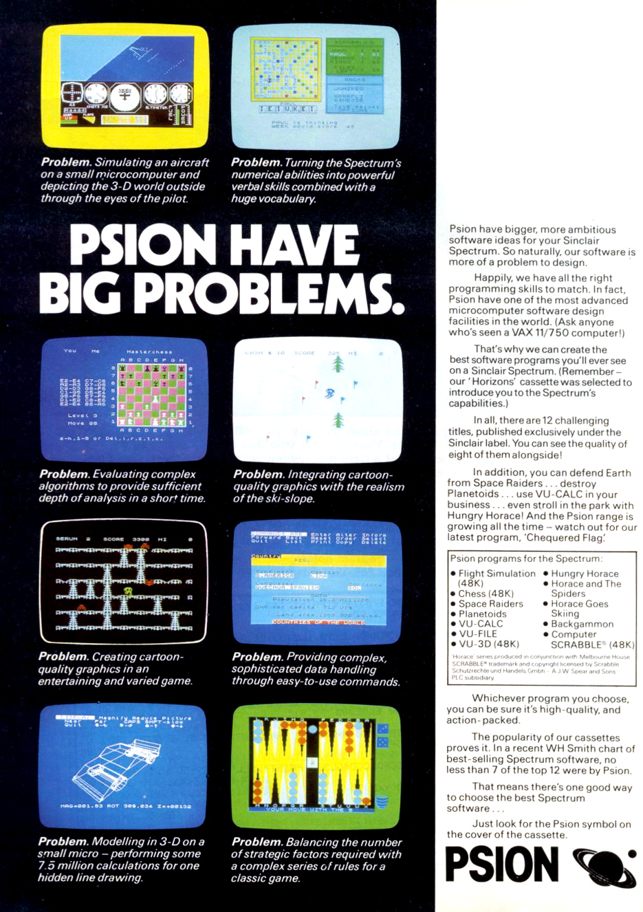 Egy évvel később a Psionnak már tényleg nagy problémái voltak: akkor már nem Spectrum-szoftvereket fejlesztettek meg a Horace-játékokat próbálták rajzfilmszerűként népszerűsíteni, hanem egy zsebszámítógépet próbáltak piacra dobni. A Psion Organiser 1984 végén került a brit boltokba, és 8K memóriájában akár 120 telefonszámot is képes volt tárolni!