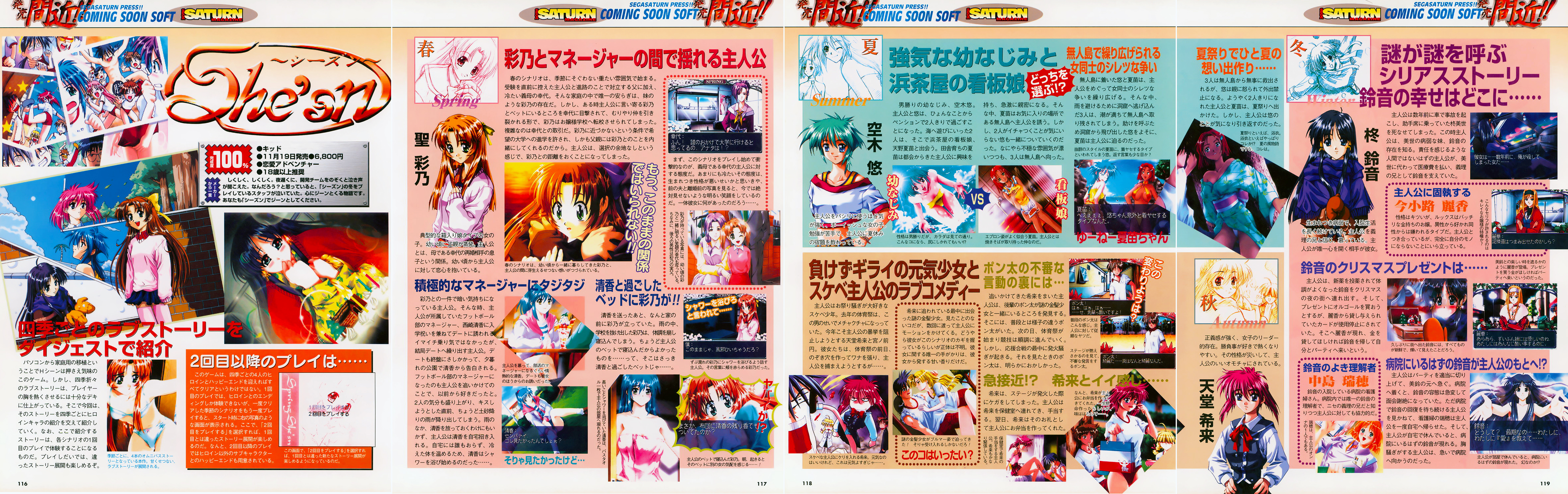 Az itt bemutatott játék egyébként egy korábbi PC-s erotikus visual novel Saturn-portja, természetesen már az explicit szexjelenetek nélkül. A játék She’sn négy, teljesen különálló, mindig új karaktereket hozó történetet kínál fel: a tavasziban a kedves sógornőjével boronálható össze a főszereplő, nyáron gyermekkori barátnőnkkel hevíthetjük fel kapcsolatunkat, ősszel a gimiben találhatjuk meg a románcot, télen pedig egy halálosan beteg lányhoz fűződő érzelmeink vezetnek elkerülhetetlenül könnyes lezáráshoz. Ha hiszitek, ha nem, a She’sn csak Japánban jelent meg.