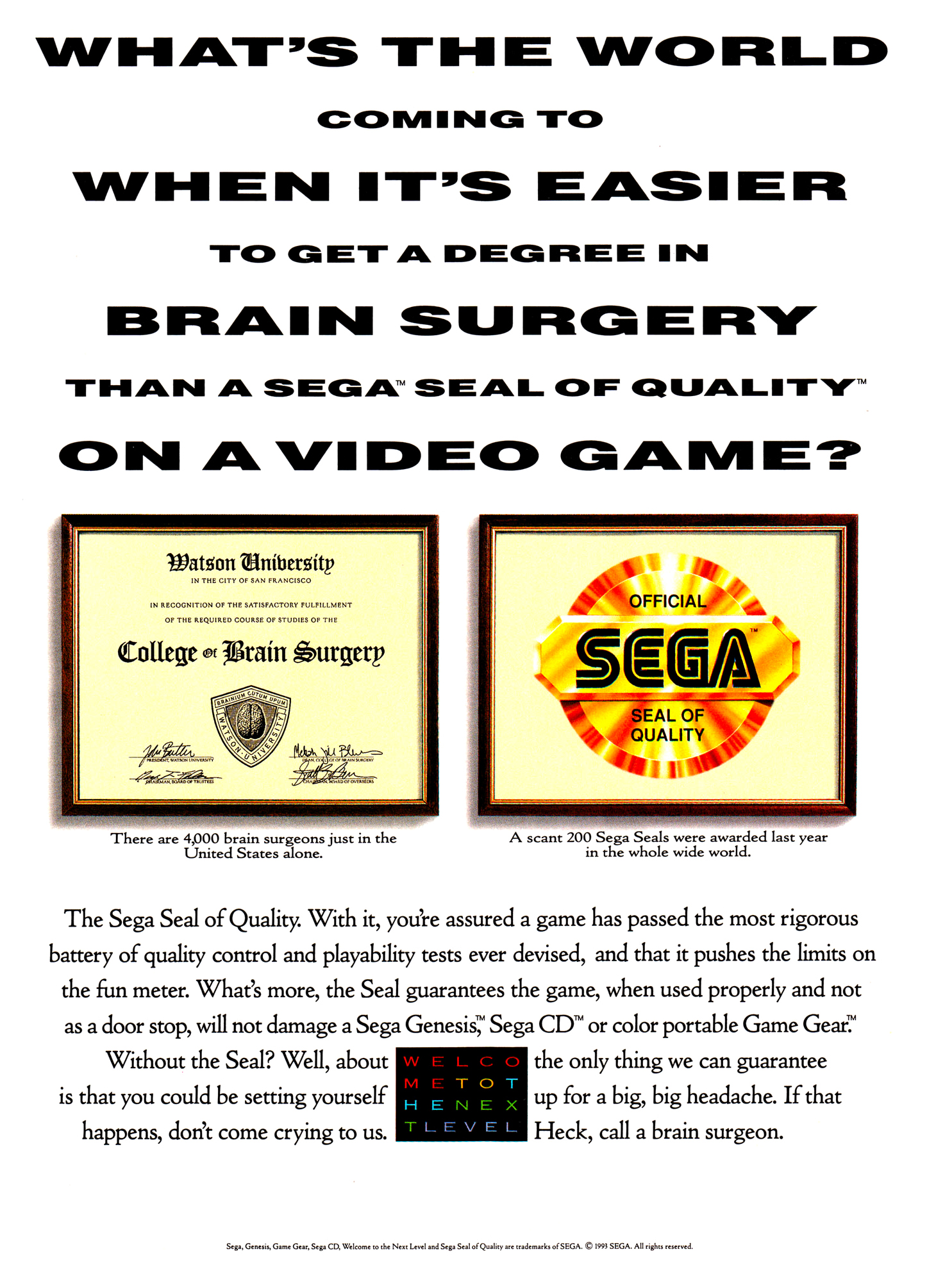 A hivatalos Sega minőségi védjegyet egyébként sokkal könnyebb volt megszerezni, mint a hasonló nintendós plecsnit: kevesebb tartalmi korlátozás szabályozta a fejlesztőket (a leghíresebb eset talán a Mortal Kombaté, aminek harcosai SNES-en fehér verejtéket fröcsköltek, míg Mega Drive-on csak úgy ömlött a vér), ráadásul nem is volt kötelező ennek „kiváltása”.