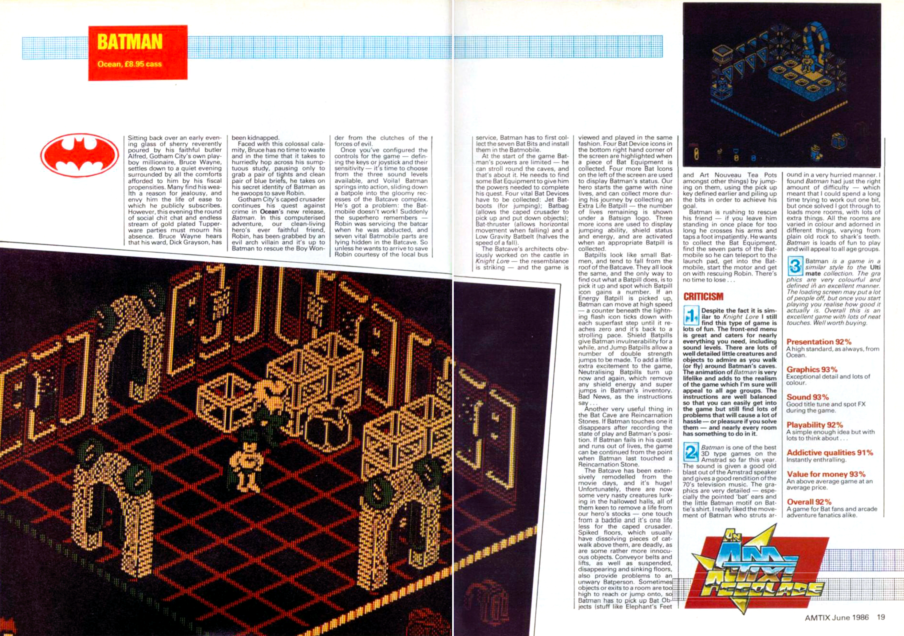 1986-hoz képest az Amtix nem csak gyönyörű screenshotokkal mutatta be a kiemelt játékokat, de a cikkek minősége is alaposan a riválisok fölé nőtt. Oké, a Batman karaktereinek a mozgására az élethű talán nem a legpontosabb jelző, de ezen felül az írás szépen bemutatja a játék alapjait és elhelyezi a hasonló játékok között is.