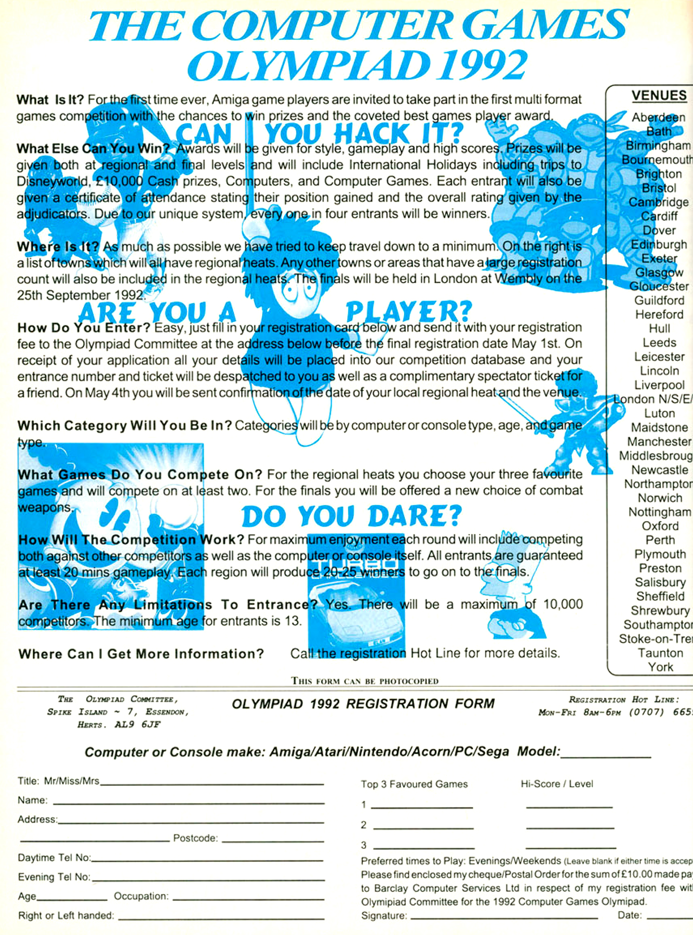 Nem kérem, ez nem az 1992-ben Londonban megrendezett Negyedik Kompjúter Olimpiádé hirdetése, hanem egy másik, kifejezetten a videojátékokra szakosodott esemény reklámja. Hogy tényleg lezajlott-e az itt leírtaknak megfelelően, azt nem tudnám biztosra mondani: az internet ugyanis sajnos nem őrzi nyomát a minden bizonnyal nemes eseménynek, a Wembley stadion pedig ügyintézői túlterheltségére hivatkozva nem ad választ efféle ősi kérdésekre.