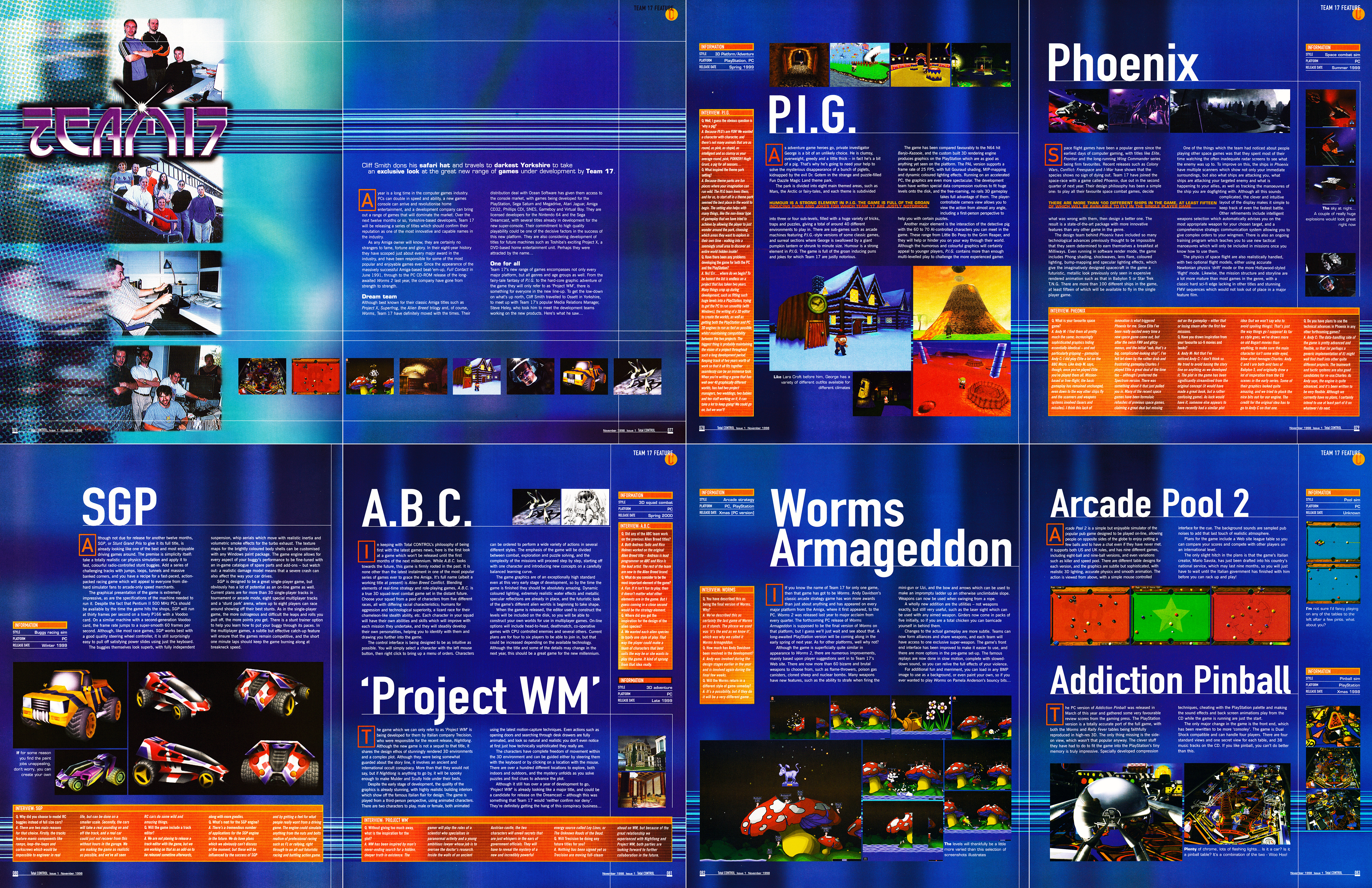 Valamikor 1998 őszén látogatta meg a Total Control magazin a Team 17 stúdiót, akkor, amikor a piciny yorkshire-i stúdió a Wormsök után befolyó vagyont rengeteg párhuzamos fejlesztés finanszírozására költötte el. A legérdekesebb beszámolók azok, amelyek végül meg nem jelent játékokról szólnak: a kifejezetten nagy költségvetésű P.I.G. például két év fejlesztés után majdnem megjelent PlayStationre és PC-re, amikor valamiért mégis törölték a projektet. Az SGP végül az EON Digital kiadó gondozásában (és Stunt GP néven) jelent meg 2001 tavaszán. Az Alien Breed: Conflict egy FPS lett volna, de ez ugyanúgy nem látta meg a napvilágot, mint az olaszok által készített horror kalandjáték, a Project WM. E játékokról később a Team 17 soha nem nyilatkozott, és további képeket sem adtak ki belőlük.