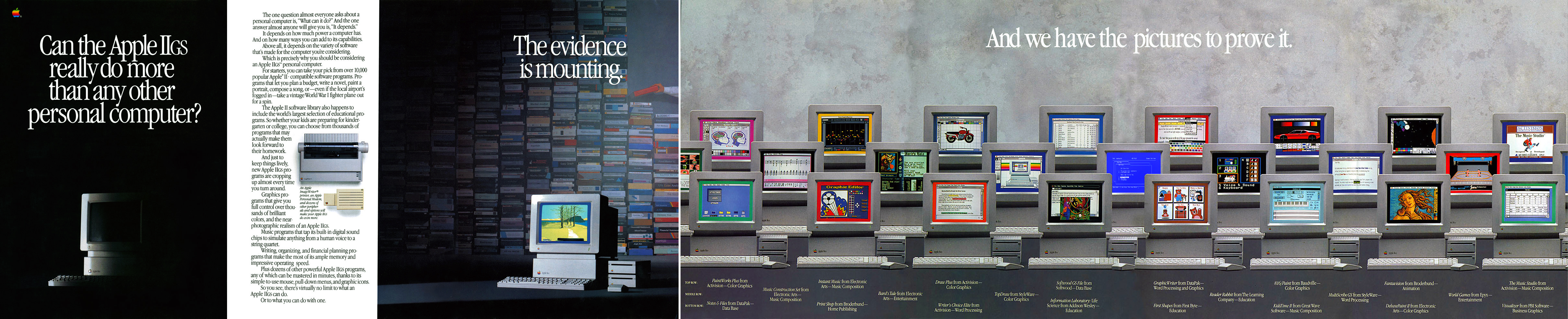 A magazinhirdetések luxuskategóriáját a rendes lapok közé tett, kihajtogatható, sokoldalas reklámfüzetek jelentik, hisz ez az extravagáns kiszerelés lényegében garantálja, hogy mindig náluk fog kinyílni az újság. Naná, hogy egy ilyen méregdrága hirdetéssel ünnepelte a gyártó az Apple IIgs 1987-es megjelenését is.