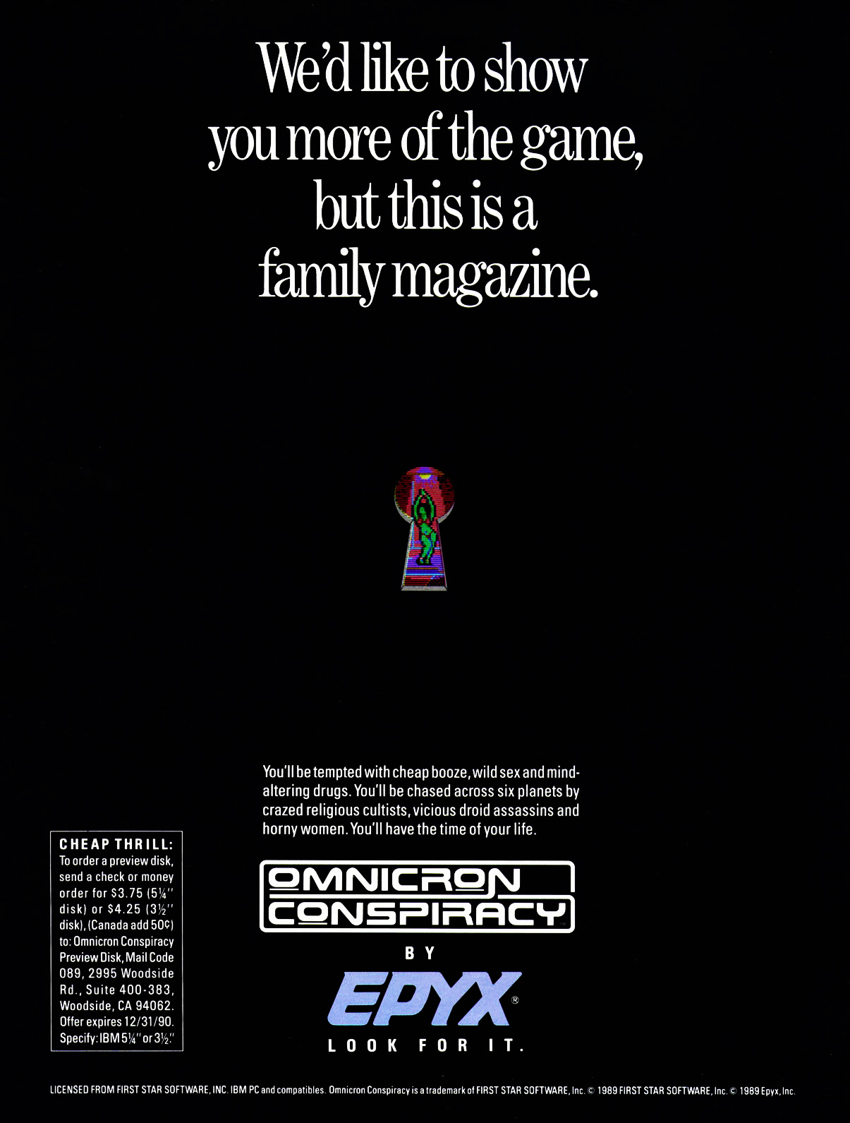 Érdekes marketingtaktika, főleg annak fényében, hogy az Omnicron Conspiracy cseppet sem erotikus játék. Egy sci-fi kalandjátékról van szó, leginkább a Sierra-klasszikusok stílusát követve. Én a magam részéről inkább a nagyszerű irányítással próbáltam volna eladni a játékot, és nem azzal, hogy az egyik helyszín hátterében 30 pixel magas táncosnők riszáltak négy teljes frame-nyi animációval...