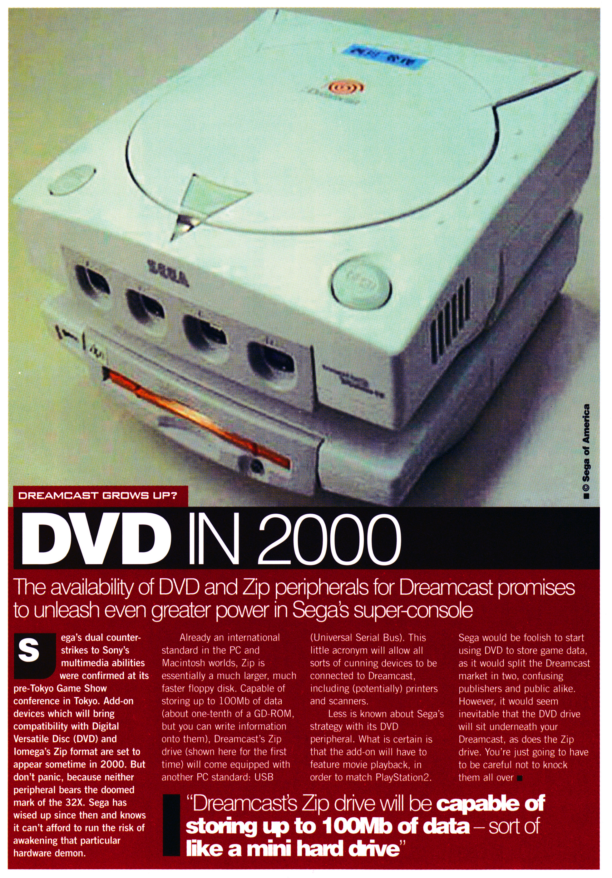 Bár a Sega eredetileg DVD-vel akarta szerelni a Dreamcast konzolokat, az ezzel járó pluszköltségek miatt inkább egy saját formátum mellett döntöttek. A gépre köthető, és kizárólag filmnézésre használható DVD-olvasó ötlete többször is előjött; hogy miért, az nem teljesen tiszta, hisz ilyen helyzetben egy közvetlenül a tévére köthető lejátszó univerzálisabbnak tűnik...