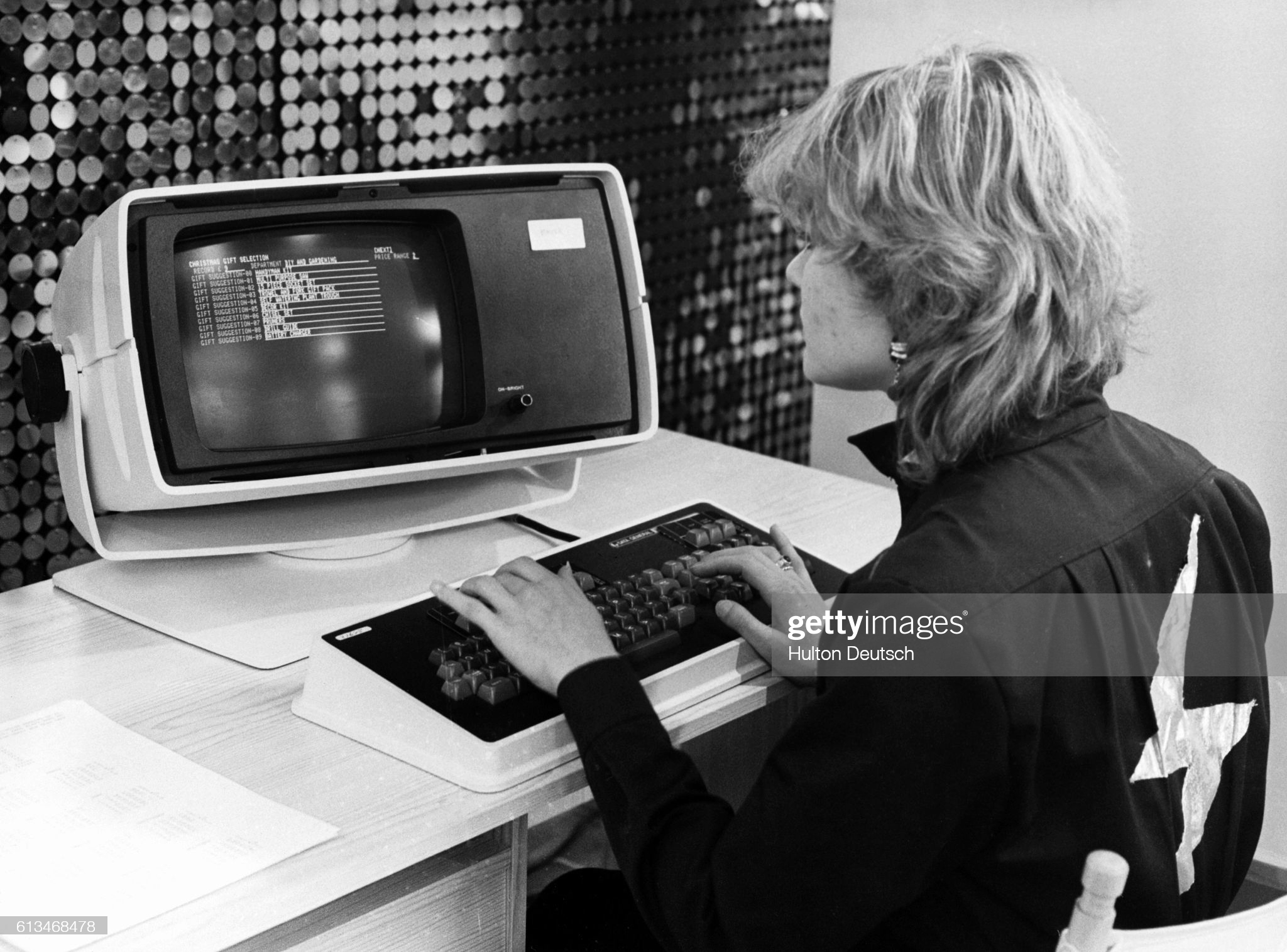Az e-kereskedelem egyik legkorábbi példája, egy 1980-as ajándéksugalló rendszer. A kensingtoni Barkers bevásárlóközpont karácsonyi büszkesége volt ez a szoftver, amely a pénzlimit megszabása, illetve az egyik áruházi részleg (például barkácscuccok, konyhai holmik, könyvek) kijelölése után tíz, e kritériumoknak megfelelő ötletet javasolt. Amennyiben a vásárló e listáról választott, egy 1981-es naptárt, valamint egy karácsonyi üdvözlőlapot is kapott ajándékba. A képen egy Michaela Roberts nevű vevő próbál válogatni a kilenc fontnál olcsóbb barkácsholmik közül.