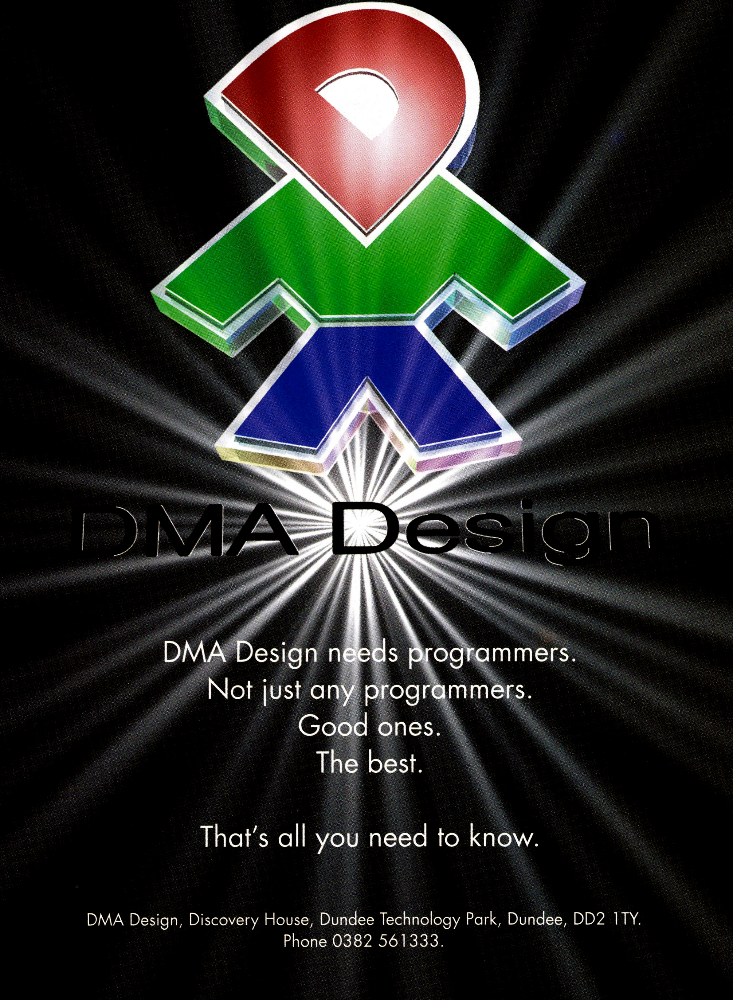Amikor ez a látványosnak, netán vonzónak igazán nem nevezhető toborzóplakát megjelent, a DMA Design már a Grand Theft Auto, illetve a Body Harvest fejlesztésével foglalkozott. Valószínűleg minden grafikus azokon dolgozott, így jobb híján a portás rakta össze a hirdetményt...