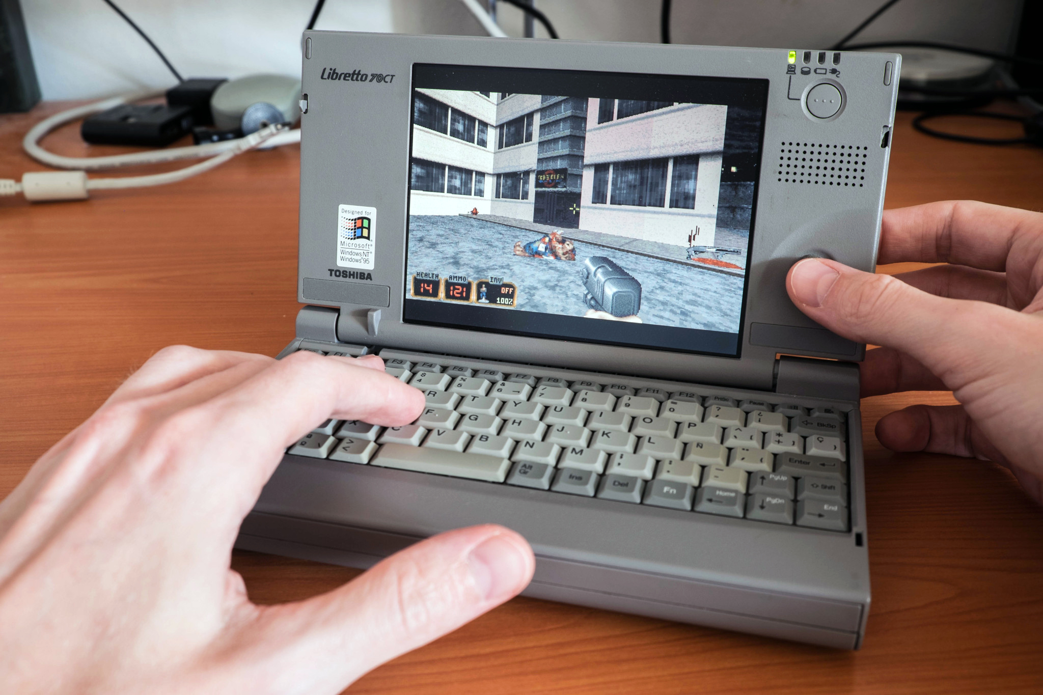 Korábban nem tudtam, hogy a hordozható számítógépeknek van egy subnotebook nevű kategóriája is, amelyben parányi gépek találhatók, mint például a képen is látható Toshiba Libretto 70CT. Az 1996-ban piacra dobott készülék teljesértékű PC volt: az apró ház egy 120 MHz-es Pentium MMX processzort rejtett, 16 MB memóriával és 1.6 GB tárhellyel. A 6.1 inch-es képernyő persze nem finoman szólva sem óriási, de még mindig kényelmesebb lehetett, mint az aprócska billentyűzet; persze, ahogy a kép is mutatja, minden problémát le lehet küzdeni...