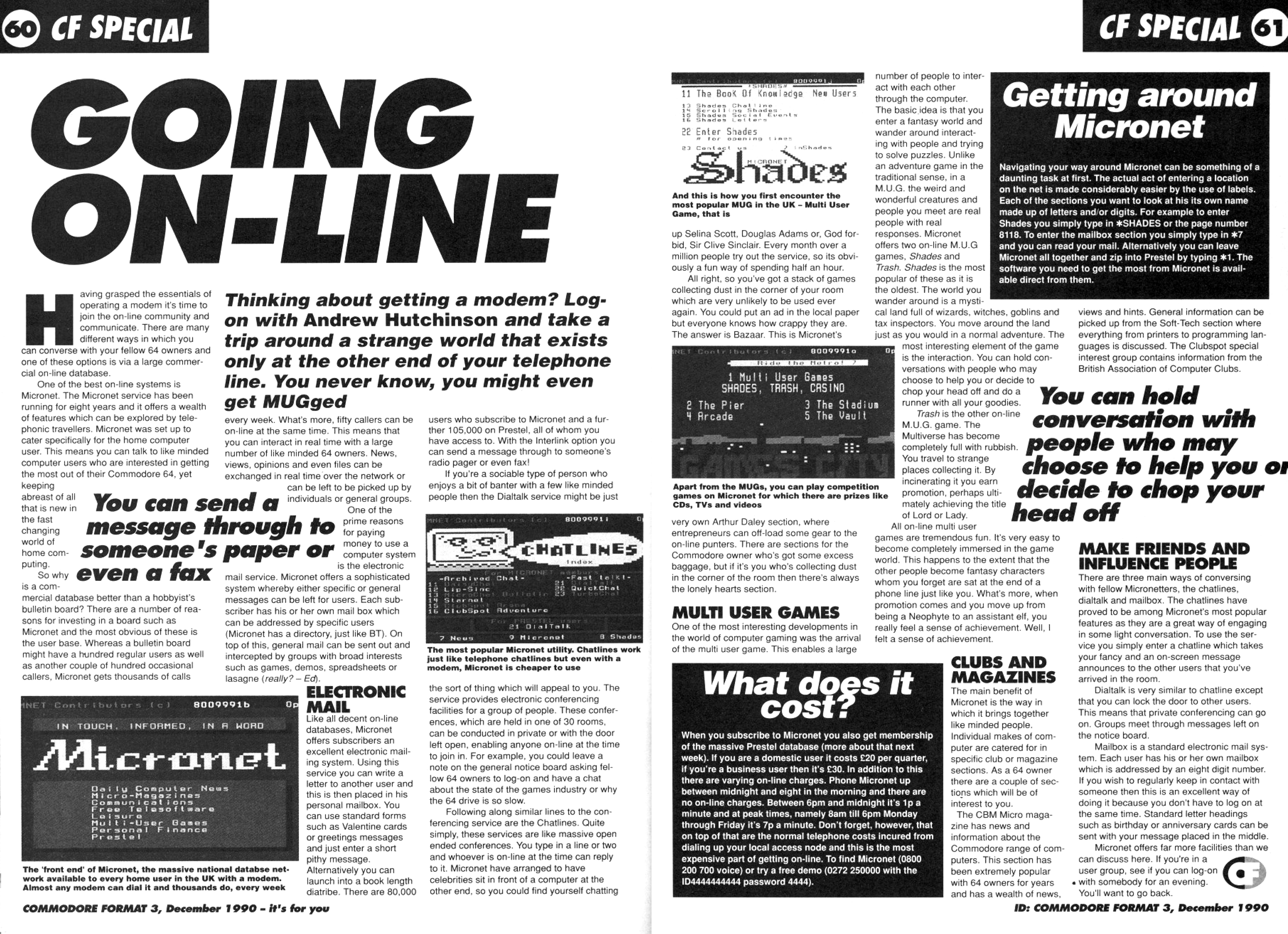 A legtöbb korabeli Commodore 64-es írás nem sok új információt tartalmaz azoknak, akik maguk is ezzel a géppel nőttek fel – viszont az efféle, a már ezen a számítógépen is meglátogatható online világokról szóló ismertetők kivételt képeznek. Magyarországon nagyon kevés Commodore 64-es modem lehetett 1990-ben, és lefogadom, azok túlnyomó része is inkább cégeknél, állami szerveknél, gyárakban lehetett beüzemelve. Pedig már léteztek multiplayer játékok is (akkor még MUG néven), és persze chatelni, adni-venni és fórumozni is lehetett.