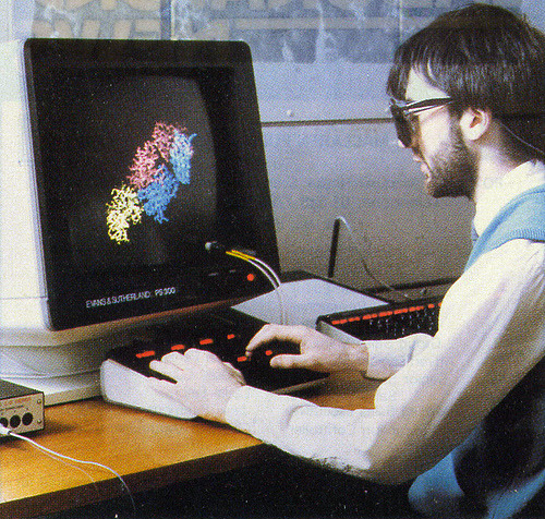 A leedsi Astbury Centre strukturális molekuláris biológiával foglalkozó központban egy kémikus egy lizozim-antitest molekula térhatású verzióját vizsgálja egy speciális szemüveg segítségével. A fénykép készítésének dátuma nem ismert, de a kísérlethez használt Evans & Sutherland PS/300 Picture System számítógép 1981-től volt megvásárolható. Ennek vektoros kijelzője tökéletes volt a 3D-s ábrák kijelzéséhez, forgatásához és manipulálásához.