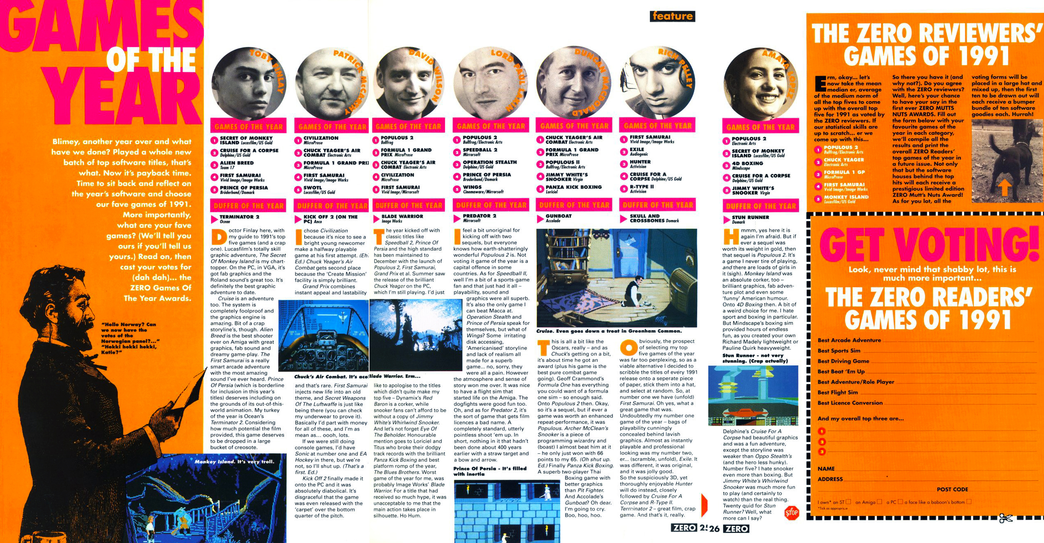 A Zero magazin szerkesztői közül megdöbbentően kevesen ismerték fel a Monkey Island zsenijét az 1991-es „év játéka”-szavazáson; pedig mondjon akárki akármit is, a Cruise for a Corpse nem volt annál jobb kalandjáték. A legtöbb jelölést a First Samurai, a legtöbb első helyet pedig a Populous II kapta a kollégáktól, akiknek ízlése konvergált az olvasókéhoz is.