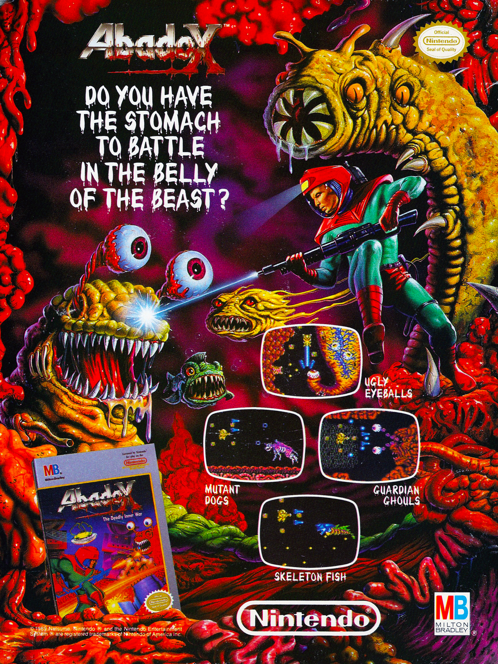 Bár a Konami által eredetileg a Gradius mellékszálának szánt Life Force első pályája is egy idegen lény belsejében játszódott, az Abadox teljes mértékben erre a koncepcióra épít. Ráadásul igen okosan: az első pálya még a világevő Parasitis külső pusztítását mutatja, majd elkerülve a hegyes fogakat berepülünk a szájába, megszórjuk lézerrel a nyelvét, majd folytatjuk undorító utunkat lefelé (emiatt egyébként a vertikálisan scrollozó részek fura módon szintén lefelé haladnak). A játék végén felmarkoljuk az emésztőnedvek által fenyegetett hercegnőt (aki a japán verzióban még meztelen is), és a végbélen keresztül elmenekülünk.