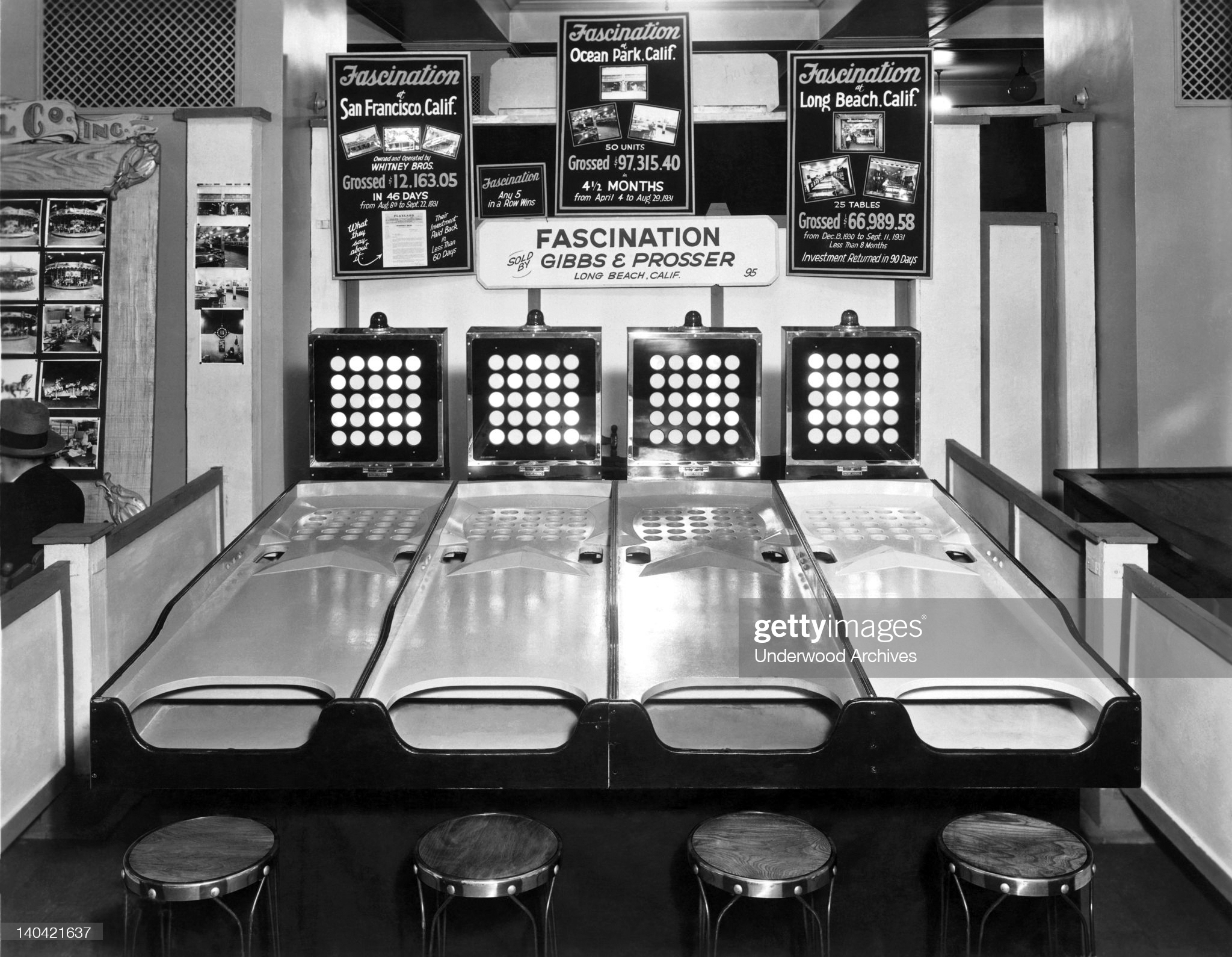 Egy 1931-es, kifejezetten a játékterem- és midway-üzemeltetők számára rendezett kiállításon hirdeti ez a konstrukció a Fascination játék nagyszerű vevővonzó képességeit és óriási bevételeit. (A midway az amerikai vásárok azon része volt, ahol az ilyesfajta játékok, erőpróbák, lövöldék voltak összegyűjtve.) A kizárólag multiplayerben (csak a hely és persze az automaták száma limitálta, hogy mennyit lehetett sorba kötni) játszható Fascinationben a játékosok feladata egy pici labda gurítása a hátul látható 25 lyuk irányába. Ha a golyó beleesett az egyik lyukba, a gép az álló lámpán felvillantja a megfelelő izzót, és a döntött felületen visszagurítja a labdát a játékoshoz – a versenyt pedig az nyeri, akinek először sikerült öt lámpát egy oszlopban, sorban, vagy átlóban kivilágítania.