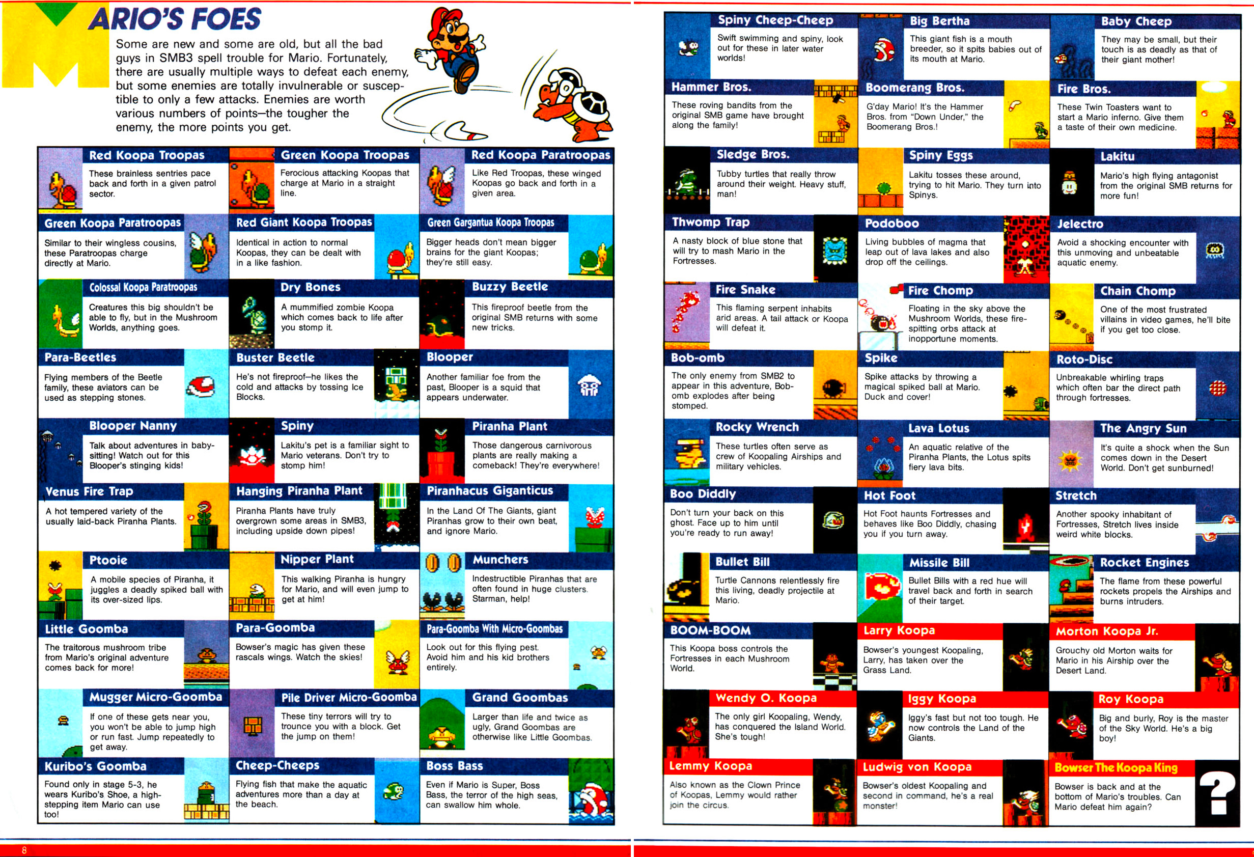 Bár sem a játék, sem a kézikönyv nem nevezte néven a Super Mario Bros. 3 ellenfeleit, a Nintendo Power magazin segítségével egy egész amerikai generáció agyába égtek bele az eltérő Koopák és Goombák nevei.