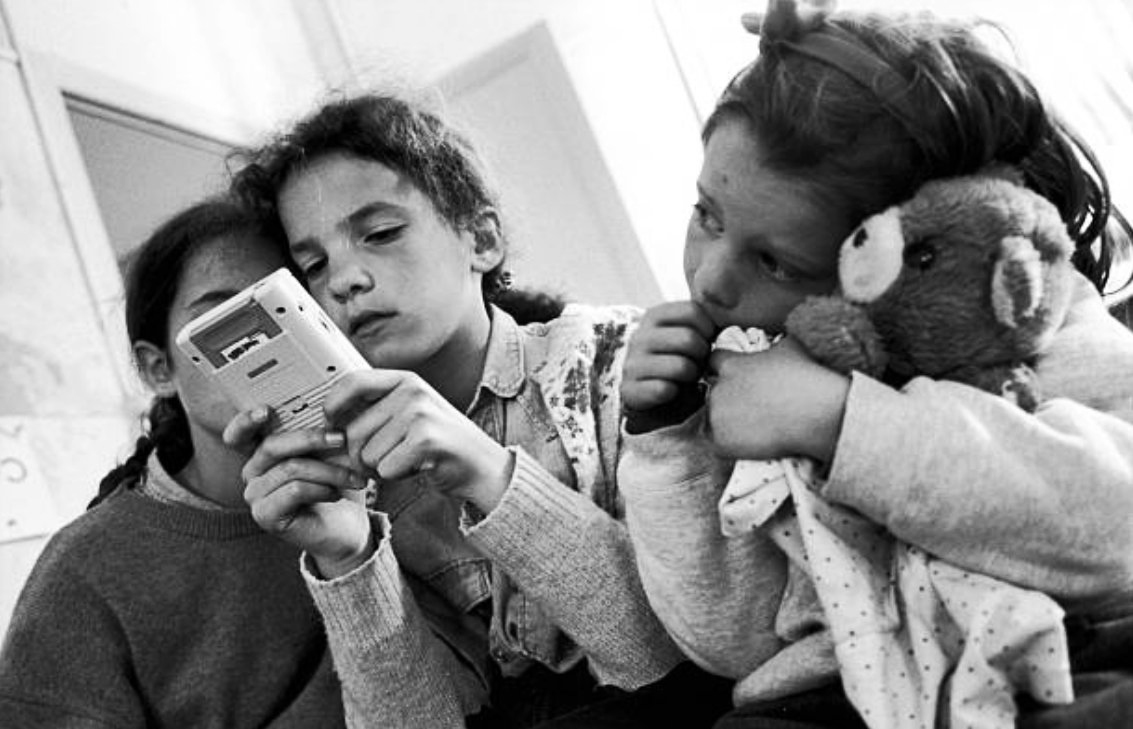 Valószínűleg nem beállított reklámfotó, hanem egyszerű családi felvétel: 1991-ben három francia lány egy Game Boyjal szórakozik.