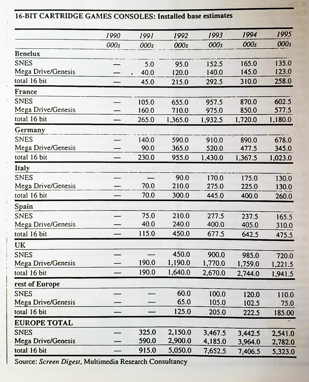 Bár ezek a számok nem közvetlenül a Segától és a Nintendotól származnak, az eddig talált legpontosabb információt adják a 16-bites konzolok európai eladási háborúiról. Ha a számok talán nem is stimmelnek pontosan, az arányok jól mutatják a kőkemény csatát, amit a két japán cég az európai vásárlók kegyeiért vívott.
