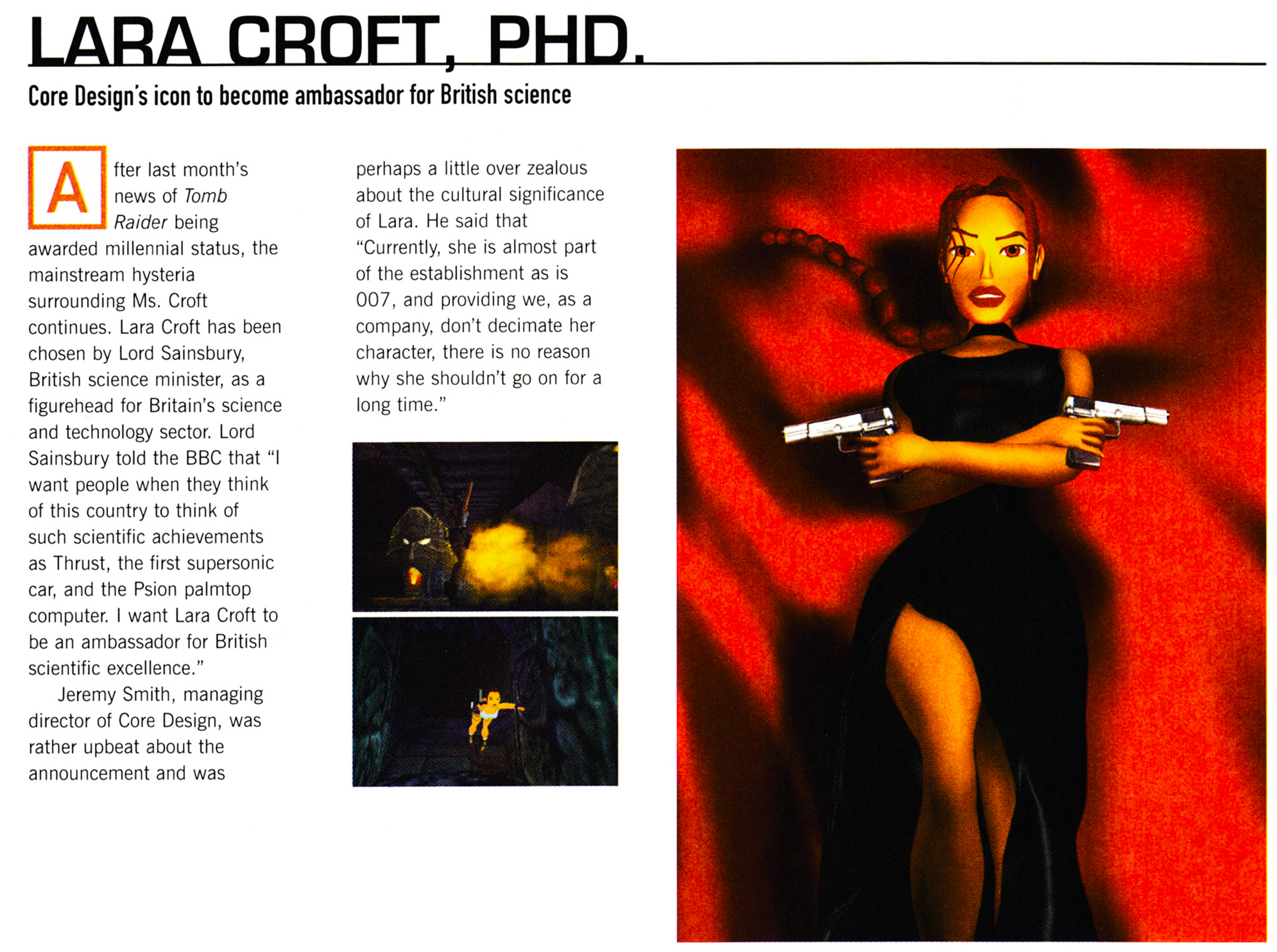A fiatalosnak látszani akaró brit kormányzat 1999 elején Lara Croftot a brit tudományos kiválóság egyik nagykövetévé választotta. Noha a cikkben felsorolt többi nagy vívmányra, a Thrust autóra és a Psion számítógépre már senki nem emlékszik, a sírrabló hölgy még ma is egész közismert; igaz, abban nem vagyok biztos, hogy ebben sok szerepe lenne a karakter brit származásának...