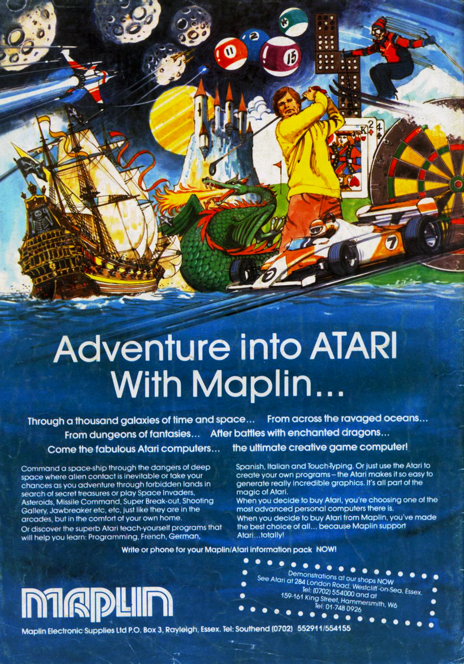 Az 1972-ben alapított, és ma is létező Maplin cég rövid ideig az Atari hivatalos brit forgalmazója volt, és 8-bites számítógépeiket ezzel a pöpec hirdetéssel próbálták eladni. Látszik, hogy ők már 1982-ben is tudták azt, amit a Commodore-nak még évekig tartott felismerni: legyenek elvileg bármire is kitalálva ezek a gépek, a felhasználók túlnyomó része játszani fog rajtuk.