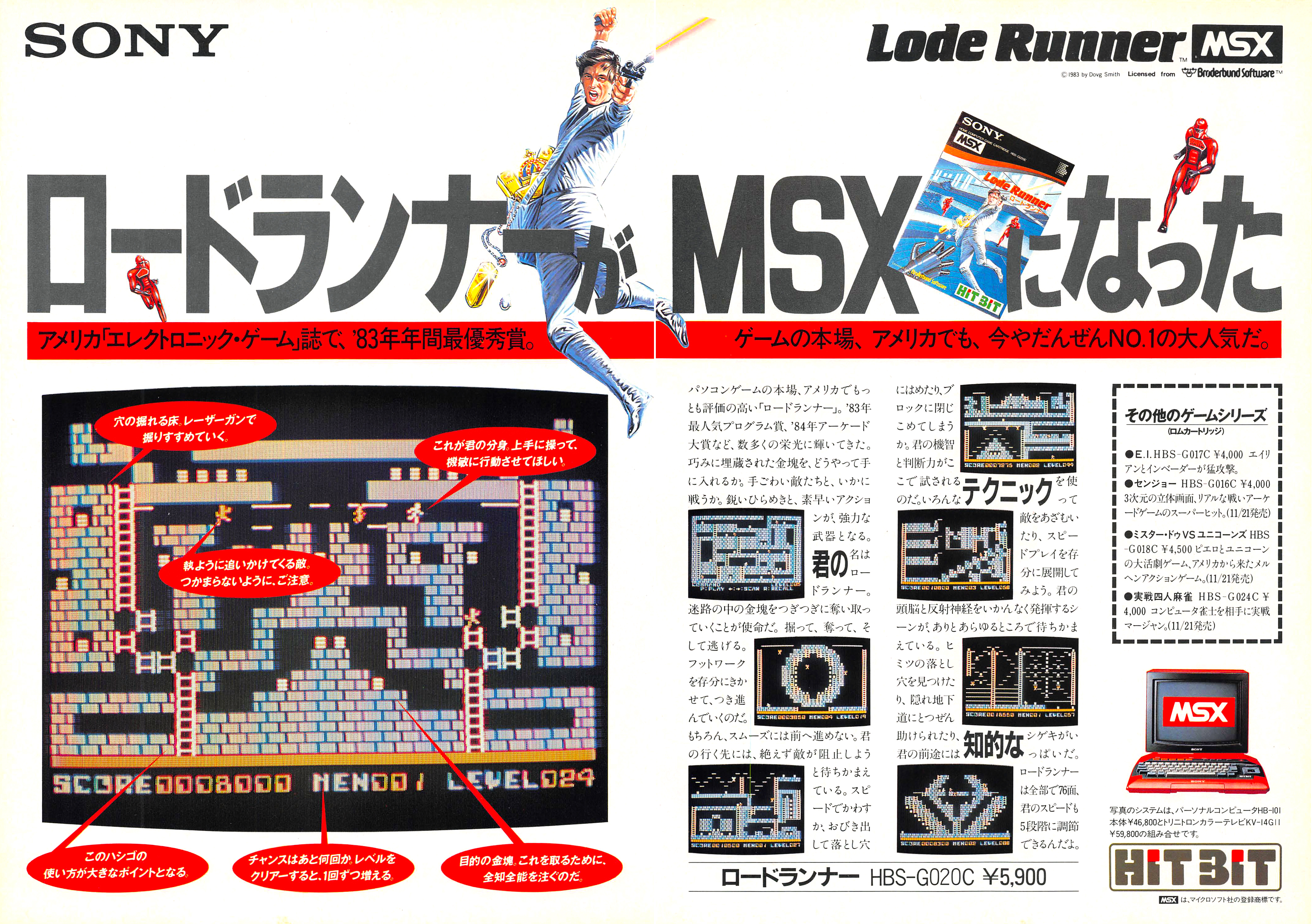 A Doug Smith által kitalált és elkészített Lode Runner felett a kiadó Brøderbund egy rosszul megfogalmazott japán nyelvű szerződésnek köszönhetően igen hamar elveszítette az ellenőrzést, és a szigetországban ezt követően tucatszám jelentek meg a folytatások, bővített kiadások, pályacsomagok és portok. Az itt hirdetett verzió viszont még minden téren legális volt, azt ugyanis a Sony licenszelte és portolta MSX-re. Bár a Japánban óriási sikert aratott játék e verziója természetesen minden MSX-modellen játszható volt, a Sony azt ajándékként mellékelte minden HB-10 számítógépük mellé, igencsak megmelve a HitBit-hardverszéria ázsióját.