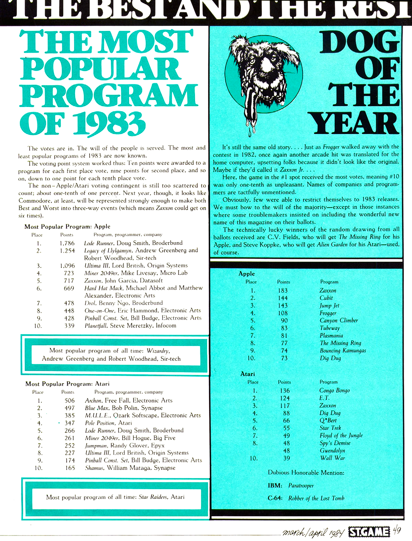 1983 legjobb játékai a Softline magazin olvasóinak szavazatai alapján Apple II, illetve Atari 400/800 számítógépeken. Jó érzés látni, hogy az Archon elfoglalta méltó helyét, de a helyezésekbe ezúttal különben se nagyon tudok belekötni.