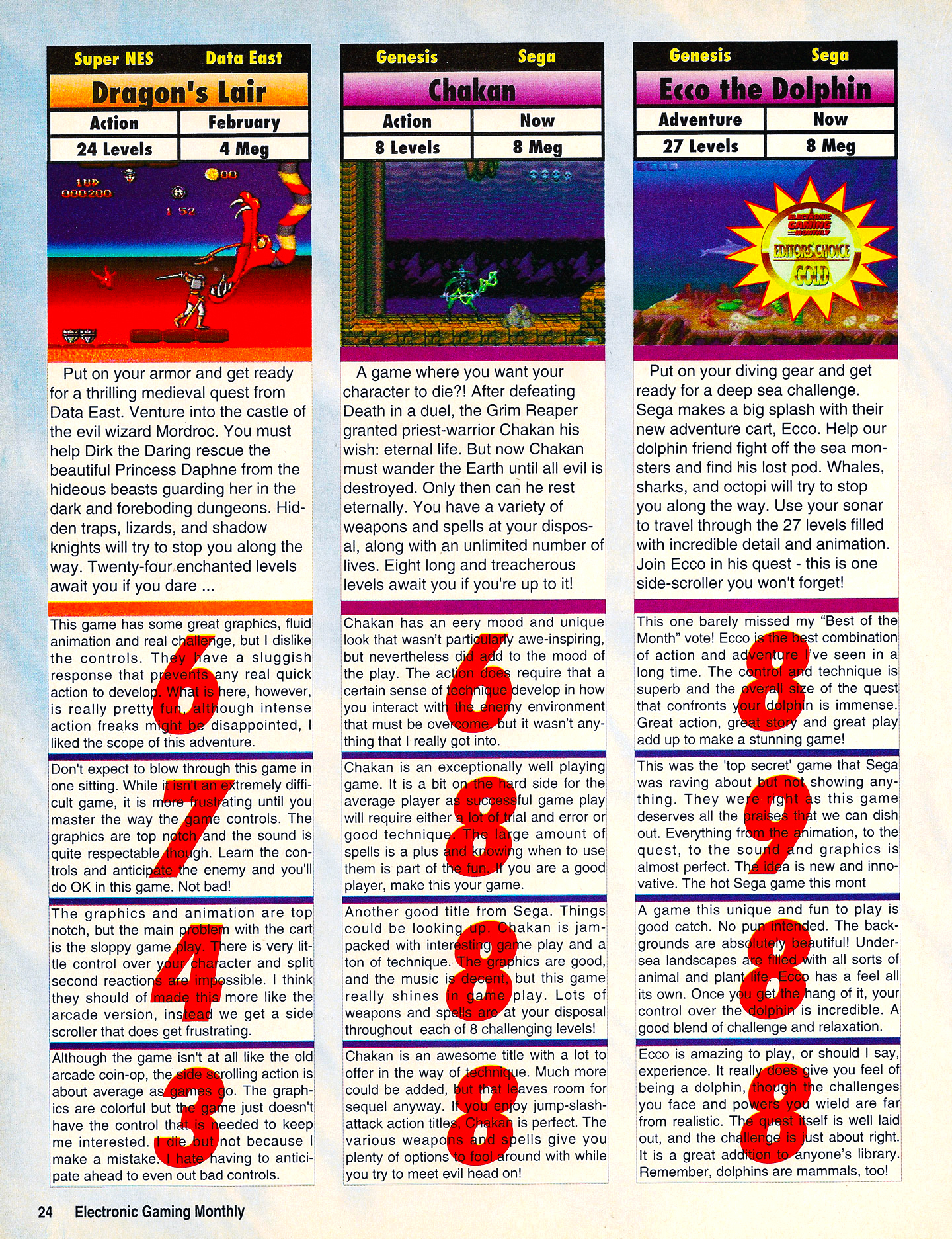 Hazánk büszkesége, az Ecco the Dolphin kiválóan szerepelt az befolyásos EGM magazin tesztelőinél, és csak azért nem lett a hónap legjobbja ezzel a remek osztályzattal, mert mind az Another World, mind pedig a Super Mario Land 2 is 9-9-9-8-as értékeléseket kapott.