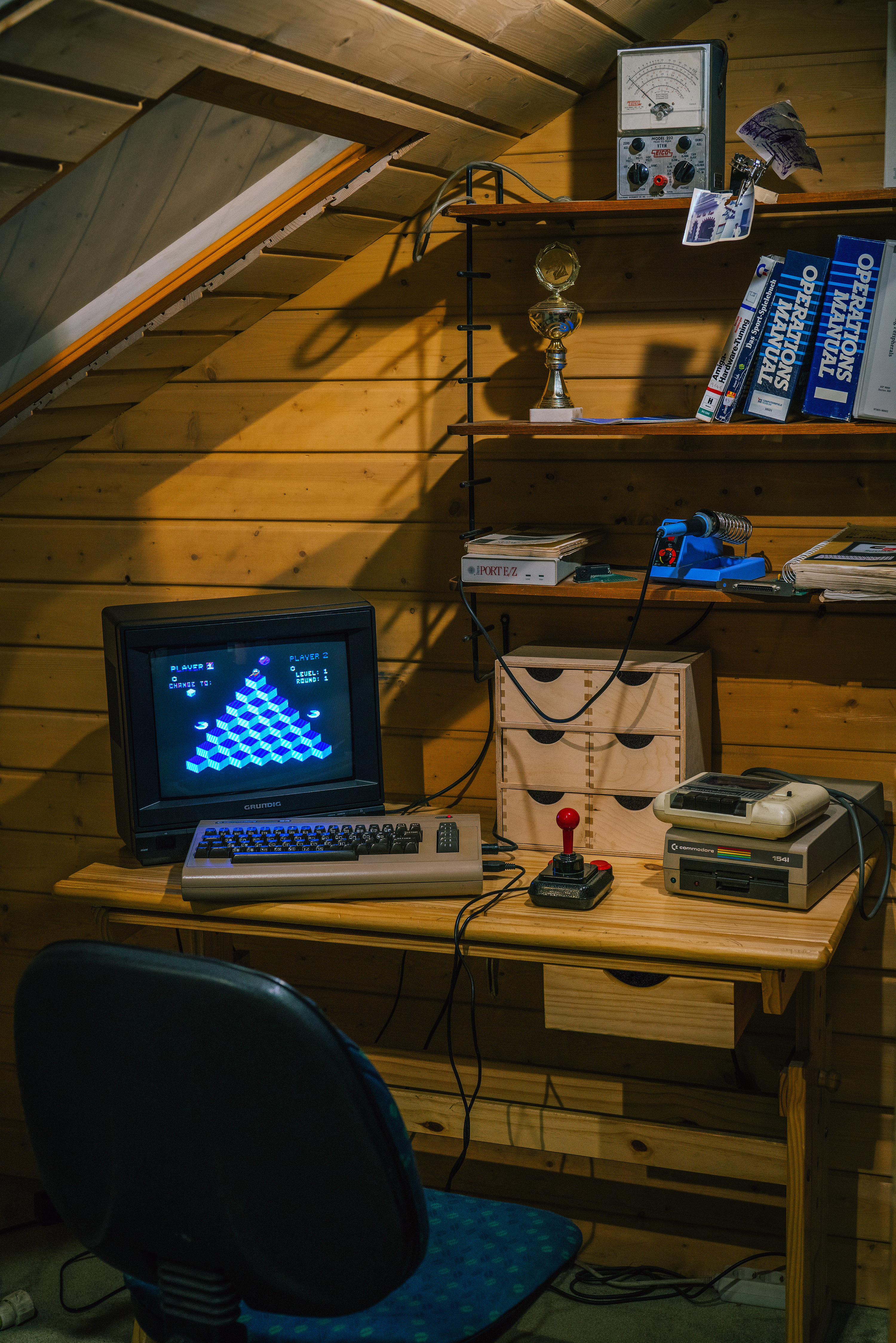A berlini videojáték-múzeumból korábban a nyolcvanas évek NES-központú amerikai tárlatát láthattuk, most pedig az echte európai hangulatot ismerhetjük meg: a Commodore 64-en még a Q*bert fut, de a polcon sok más érdekesség mellett már egy amigás programozási könyv is megbújuik.