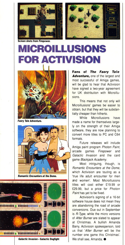 Persze, érdekes dolog, hogy az Activision megszerezte a kaliforniai MicroIllusions játékainak brit terjesztési jogait, de engem inkább a Romantic Encounters at the Dome felejthetetlen címe nyűgözött le. Korábban nem hallottam a játékról, pedig három platformon (DOS, Amiga, Macintosh) is hódított. Oké, talán helyesebb lenne azt mondani, hogy három platformra jelent meg, hiszen szaftos, néha egyenesen explicit tartalma ellenére gyakorlatilag azonnal eltűnt a süllyesztőben.
