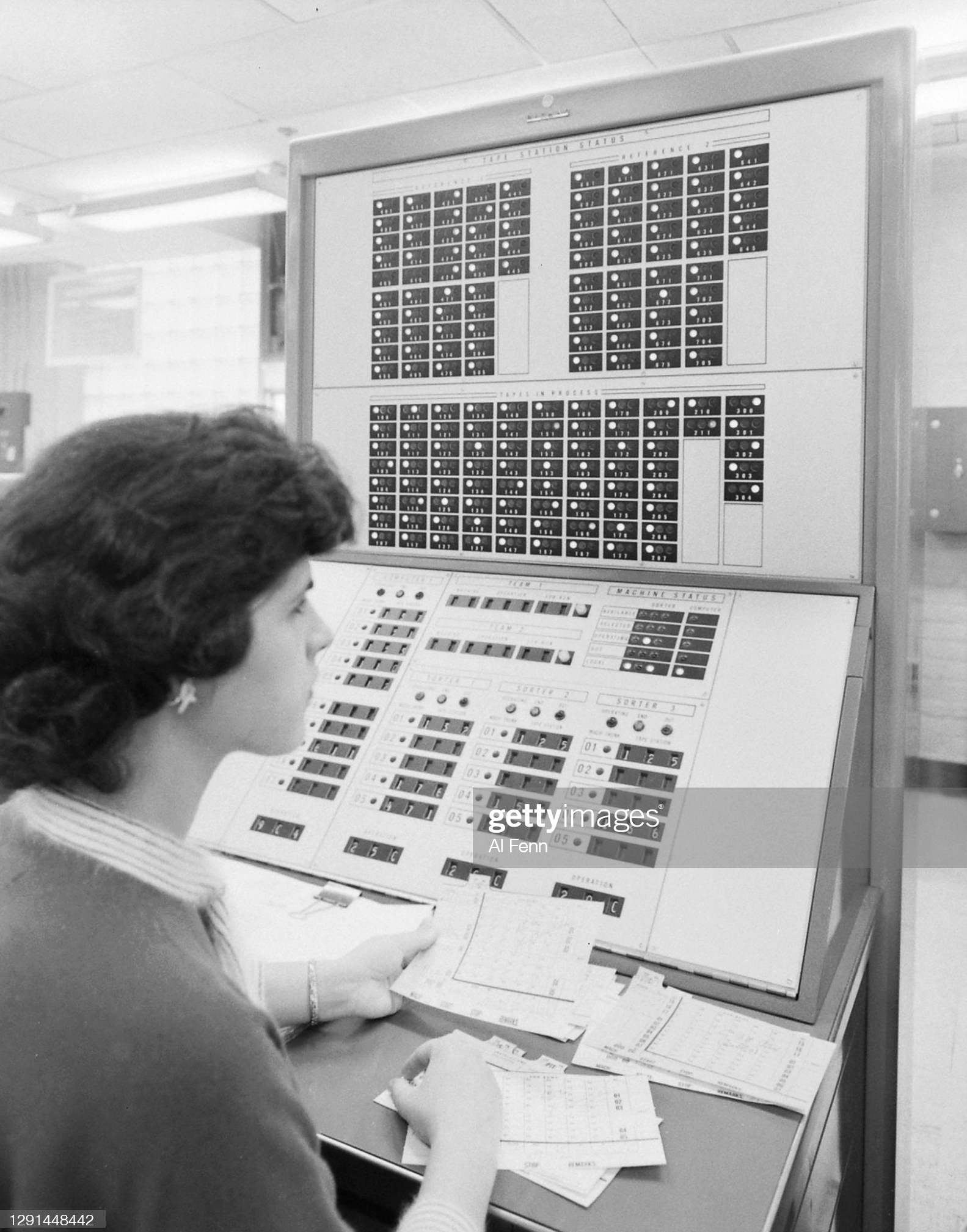 Egy RCA BIZMAC számítógép szalagkezelő irányítópanelje. Ez a hatalmas számítógép-rendszer direkt a második világháború utáni újjáépítés megkönnyítésére készült, feldolgozva és könnyen érthető formában tárolva az amerikai katonai támaszpontoktól és a szövetséges országoktól érkező több százezer igényt. A rendszer nagy újítása az volt, hogy nem kellett benne az adatokat tároló mágnesszalagokat cserélgetni: megannyi modulja több ezer ilyen szalagot tárolt, és ezek egyharmadát egyszerre tudta is használni. A kezelőpanel felső részén a hármas szalagtároló szekrények látszanak, fehérrel jelölve az éppen aktív szalagokat.
