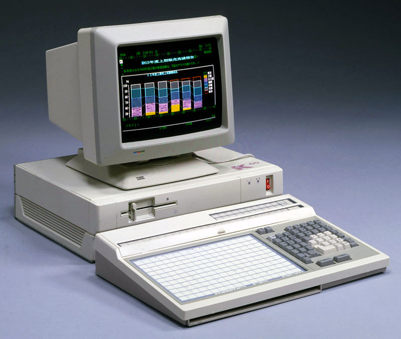 Egy 1988-as Fujitsu FACOM K-100 Model 20 számítógép. A furcsa billentyűzet nagy részét egy korai érintőpanel borítja.
