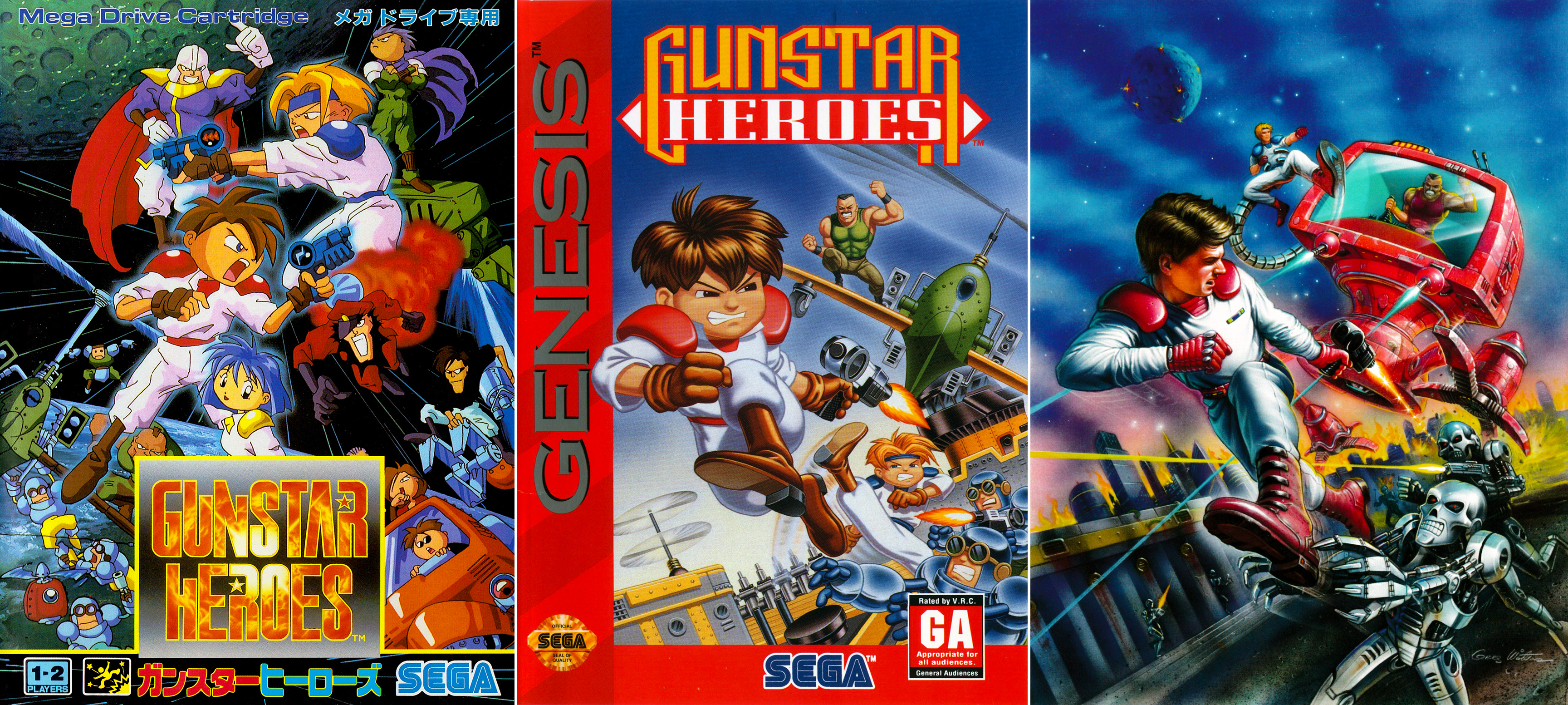 A nagyszerű Gunstar Heroes eredeti, kicsit talán szemhiányos címlapja, amit a Treasure házi grafikusa, HAN, avagy tisztes polgári nevén Tetsuhiko Kikuchi alkotott, illetve a nyugati verzióknál használt dobozkép, amelynek alkotója máig nem ismert. A jobb szélen Greg Winters grafikus eredeti címlapterve látható, amelyet a Sega túl komolynak, túl agresszívnak ítélt, ezért azt újrarajzoltatta gyerekesebb formában.