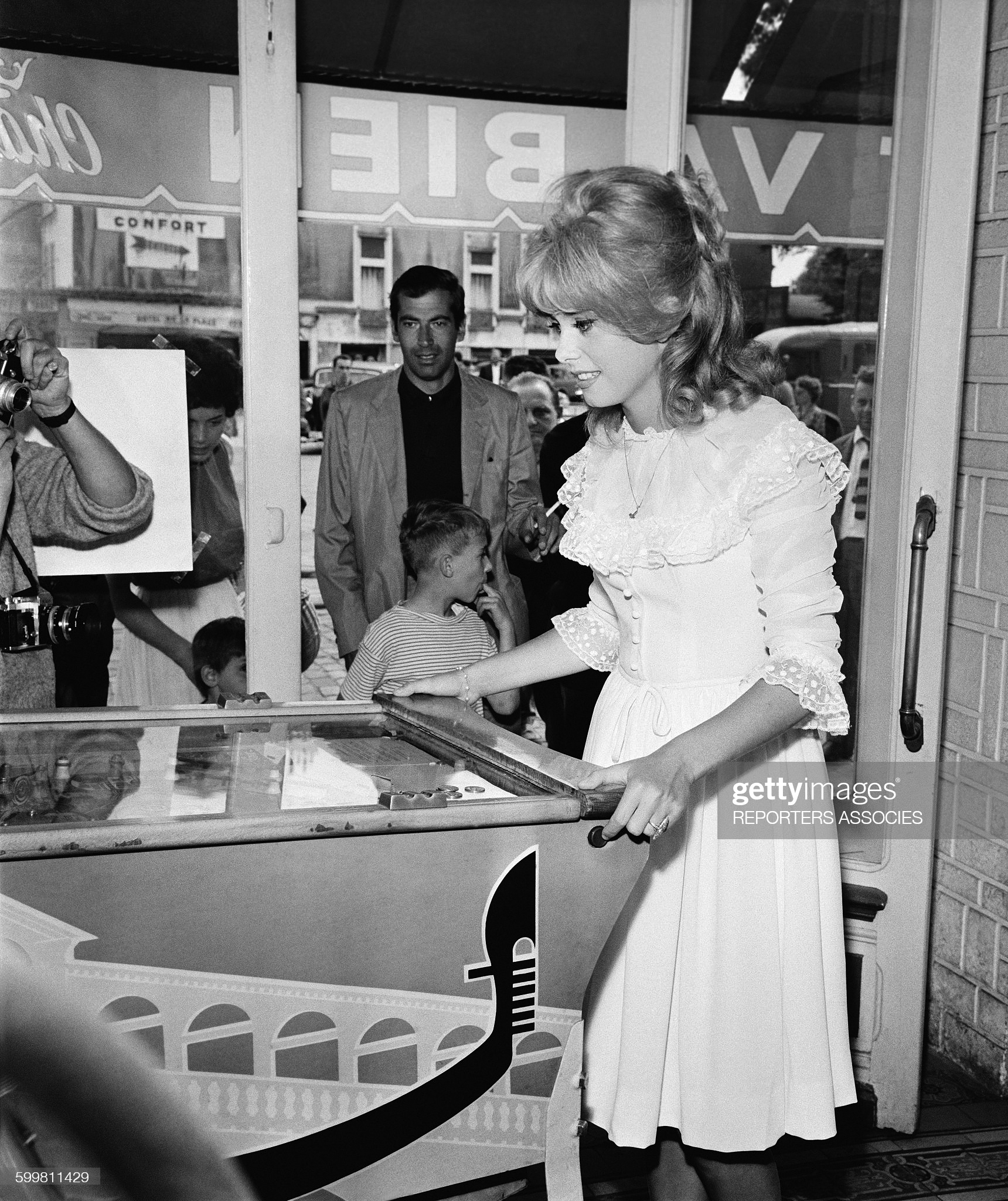 A fotón a 19 éves Catherine Deneuve koncentrál az asztalra (valaki felismeri a festést?), miközben egy sereg bámészkodó, köztük a rendező, a 34 éves Roger Vadim (akitől a következő évben gyermeke is születik) messziről drukkol.
