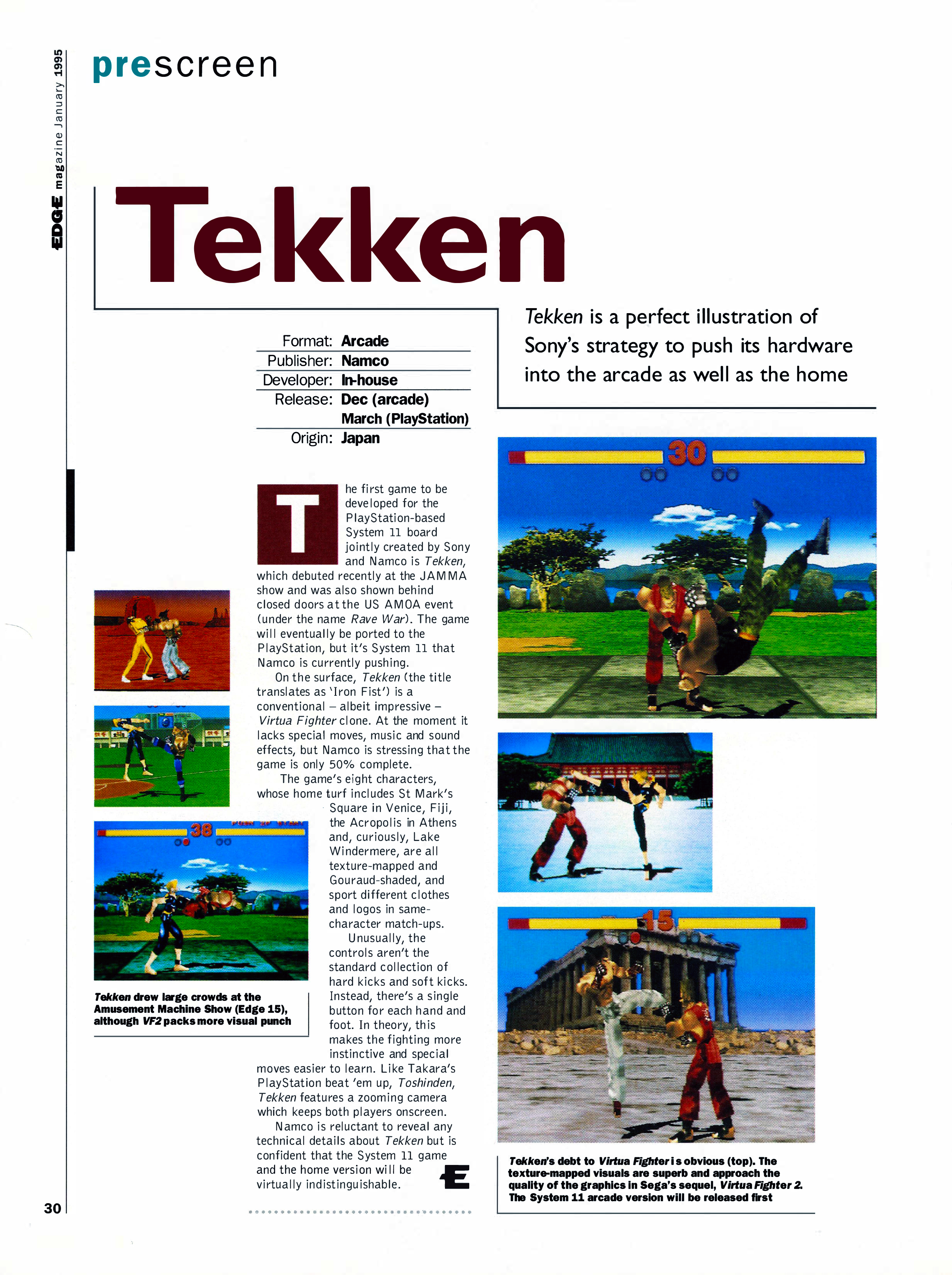 Ritka pillantás a félkész Tekken (korábban Rave War) kulisszái mögé. A játéktermi verzió tényleg csak nyolc karakterrel jelent meg; pontosabban nyolc játszható karakterrel. Ezek mindegyike kapott ugyanis egy kinézetében különböző, de mozgáskultúra terén klónként működő karaktert is – így született meg például King mellé Armor King, Nina mellé Anna, Yoshimitsu mellé pedig Kunimitsu is.