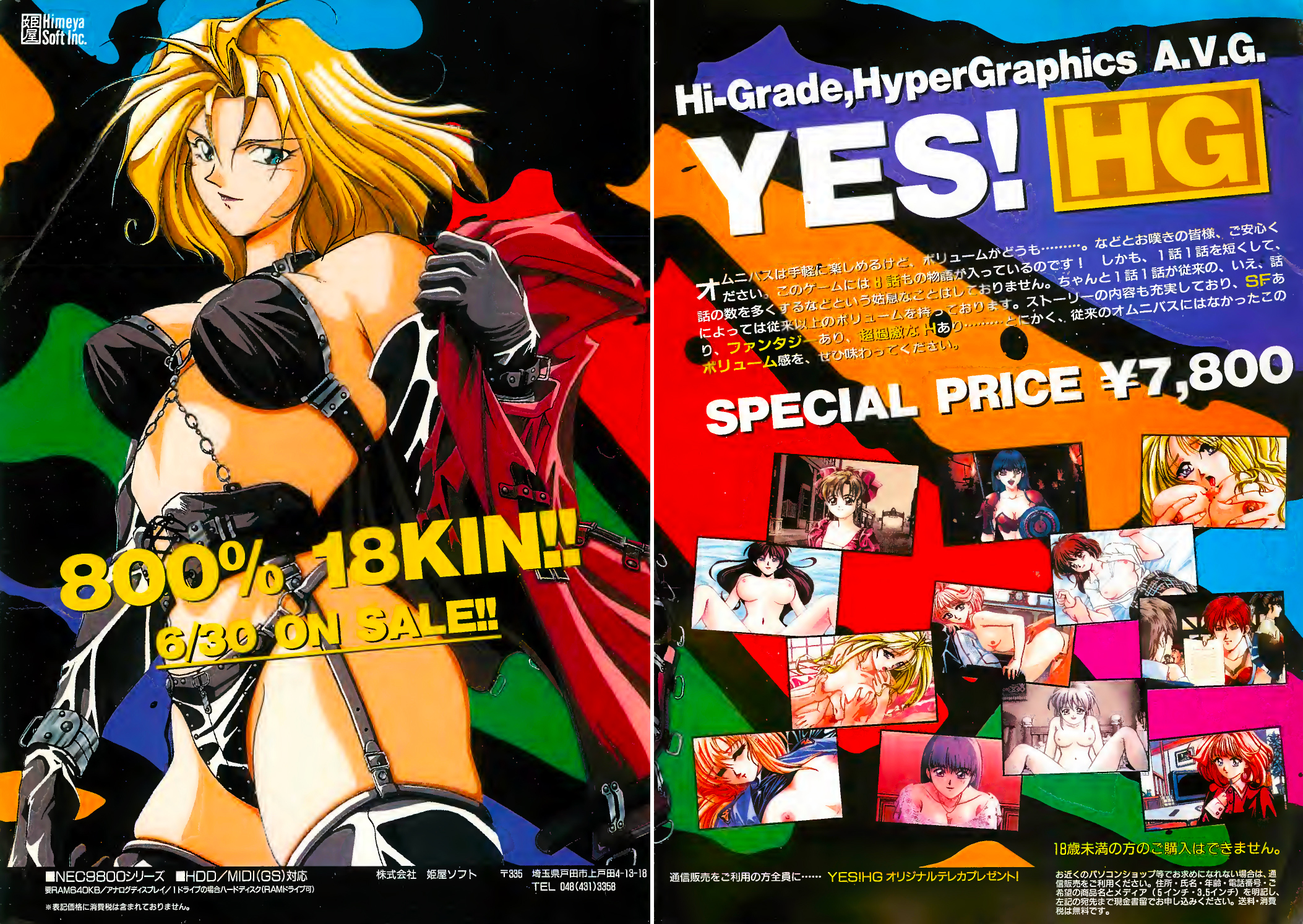 Na, megtalálod ennek a tizenkettő-egy-tucat fétispornó-játéknak a címét a kétoldalas hirdetésen? Segítek: a néha ennél jóval igényesebb programokat is készítő Himeyasoft a sokatmondó Yes! HG néven dobta piacra a szoftvert. A későbbi, szinkronnal ellátott verzió ebből kiindulva nem is lehetett más, mint YES! HG – Erotic Voice Version. És most, hogy ennyivel beljebb vagyunk, valaki most elmagyarázhatná, hogy a „800% 18KIN!!” szlogennel vajon mit is akart mondani a költő...
