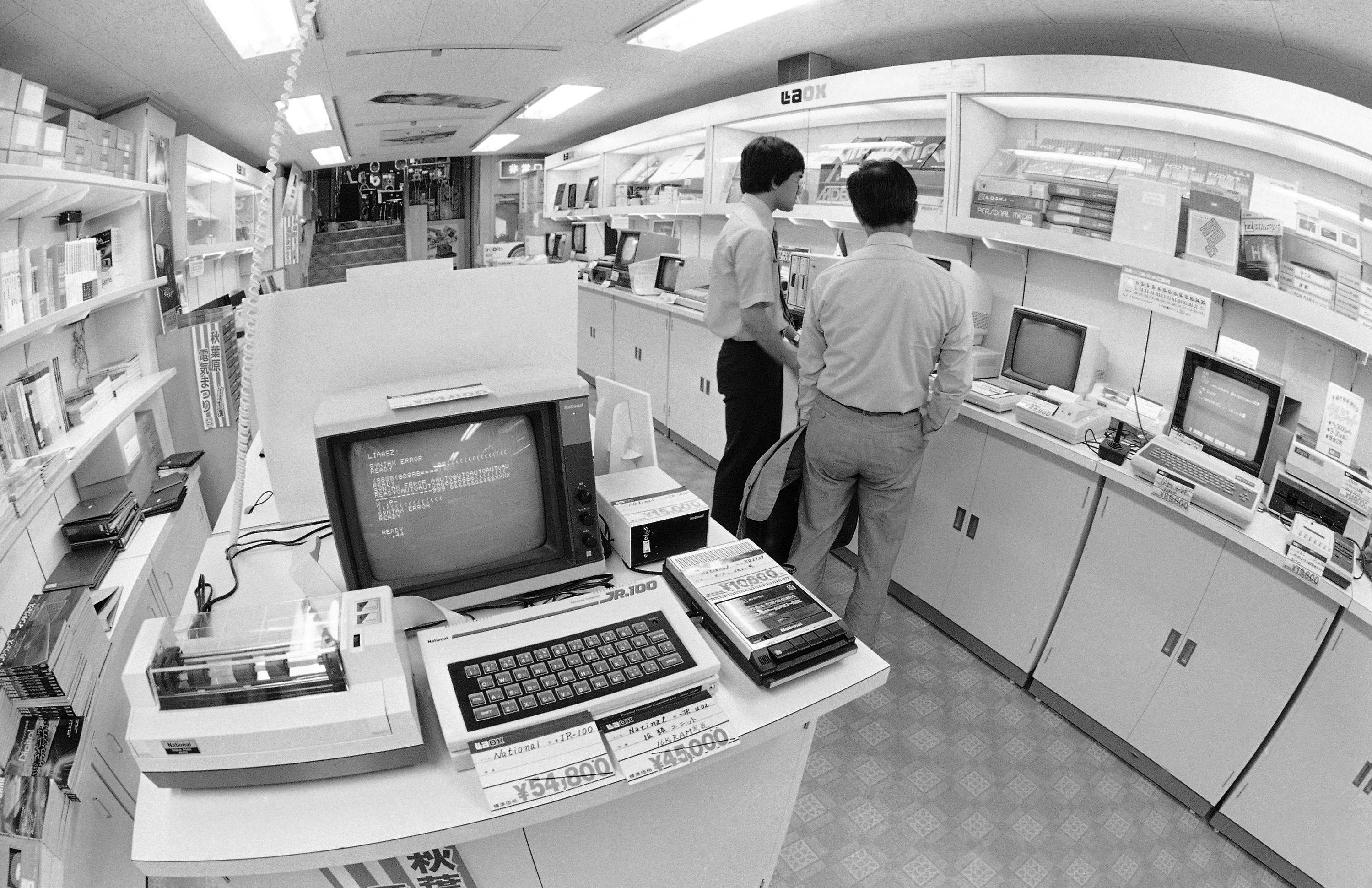 Akihabara egyik legjobban felszerelt számítógépes üzlete, a ma is létező Laox 1982. június 23-án. A főhelyen egy National JR-100 számítógép dob éppen szintaktikai hibát. A National a Matsushita prémium számítógépes brandjének volt a neve; Japánon kívül pedig a Matsushita a könnyebben kiejthető Panasonic nevet használja a mai napig.
