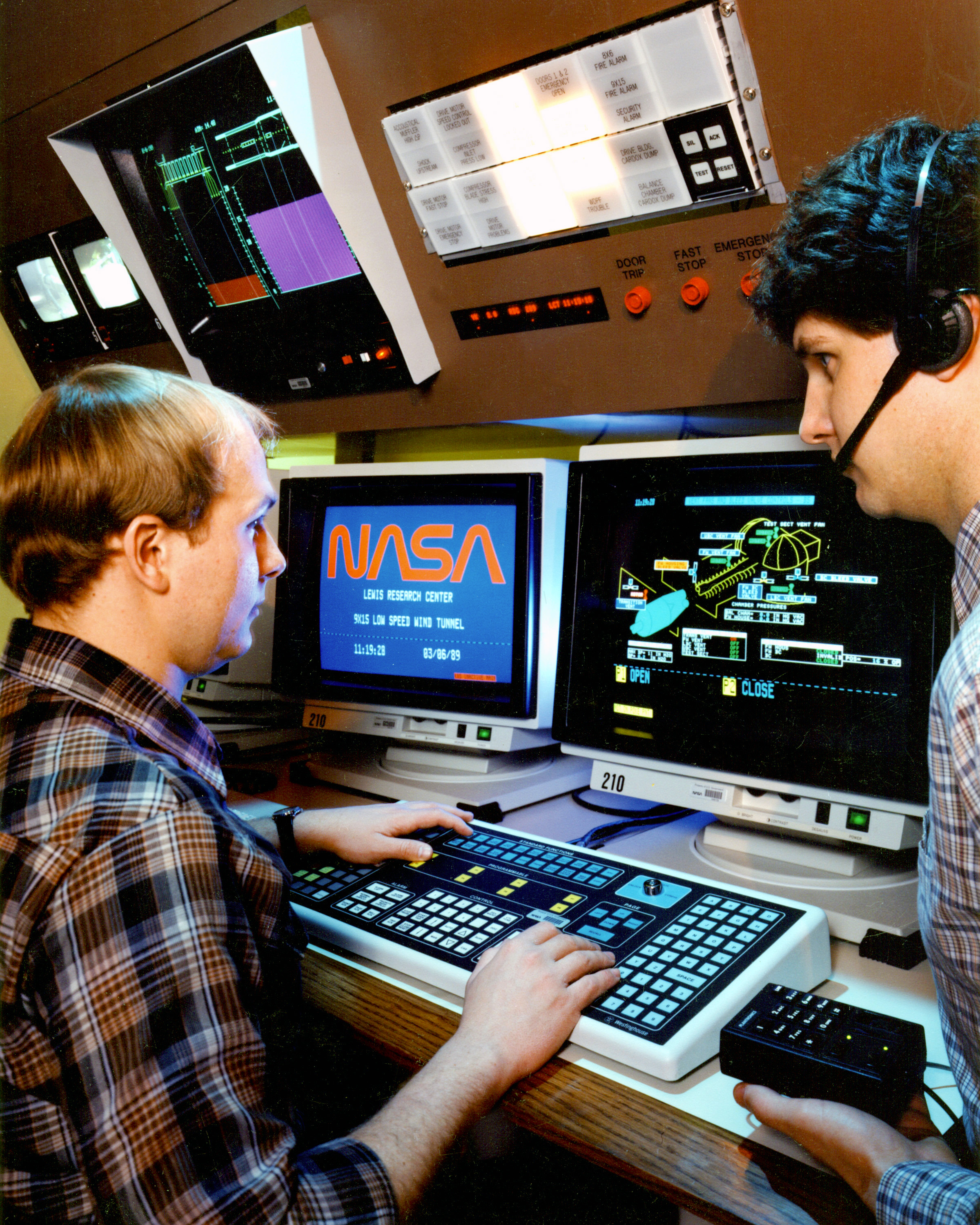 Az egyik monitor alapján ezen az 1989-es NASA-fotón éppen egy szélcsatorna-tesztelés előkészítése zajlik. Vélhetően ez igen fontos lépés volt az űrkutatásban, hiszen a két mérnök arcáról totális koncentráció olvasható le.