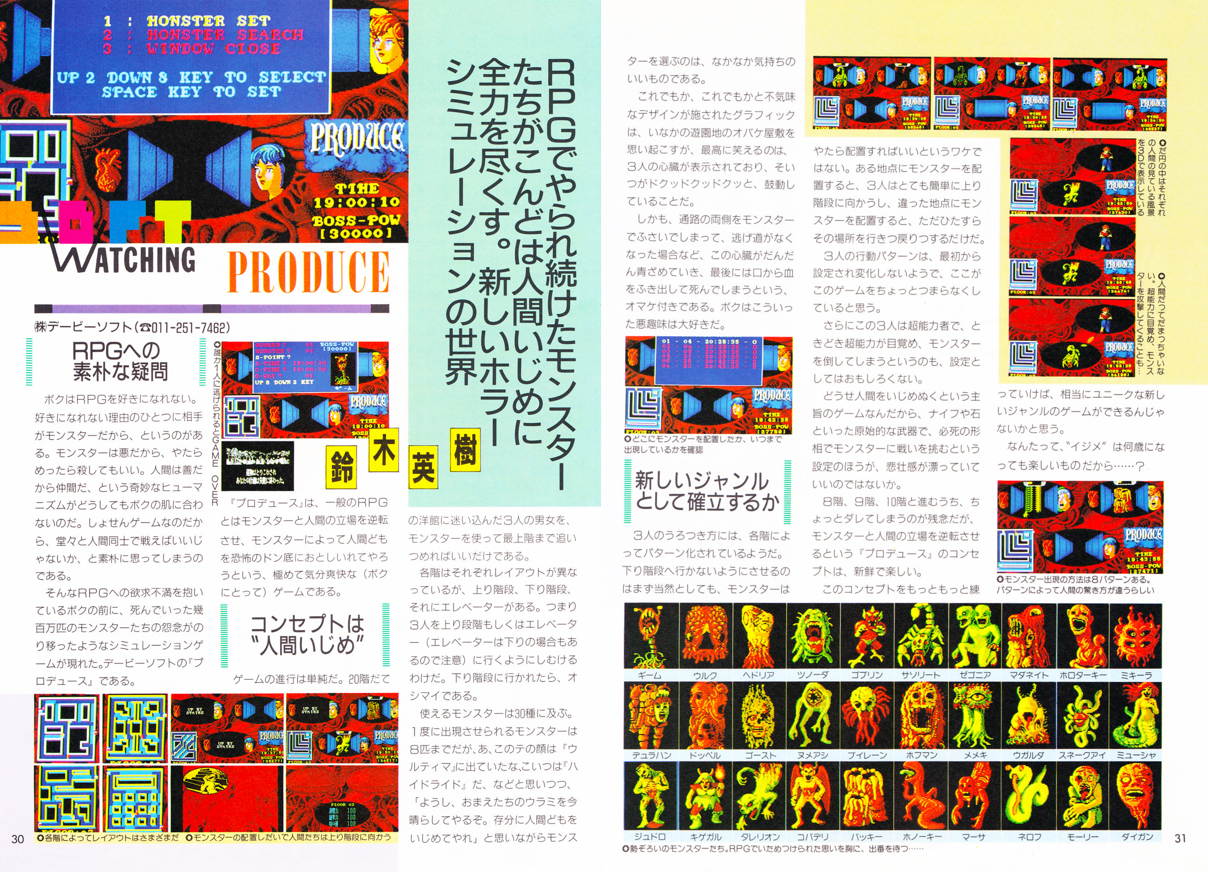 Bár a Produce cím talán valami mókás zöldségtermelő játékot juttathat az ember eszébe, a dB-SOFT 1987-es játéka nem erről szólt. Nagyon nem; a Produce egy brutális, valós időben zajló horrorjáték volt, amelyben ráadásul a játékos bizony a horror oldalán dolgozik. Karakterünk egy csúf szerelmi háromszög legrosszabb sarkán találja magát, amikor kiderül, hogy vágyainak tárgya, a csinos Sayaka bizony sajnos a fess Gilbertért rajong. Toshio erre totális őrjöngésbe lovallja magát, és lepaktál valami démonnal pajtásai elveszejtése érdekében (a karakterek mind a Nemzetközi ESP Intézet tanoncai, így a „másik oldal” nem ismeretlen számukra). Toshio feladata az, hogy este héttől reggel ötig 30 különböző, stratégiai játékhoz hasonlóan lerakható yokai szörnyeteggel sakkban (és lehetőleg szívroham-közelben) tartsa osztálytársait – ha „barátai” elmenekülnek, Game Over az eredmény, ha viszont sikerül a taktikusan elhelyezett bestiákkal a toronyház tetejére hajtani a többieket, a felkelő nappal együtt Sayaka cseppet sem őszinte szerelmét is elnyerhetjük.