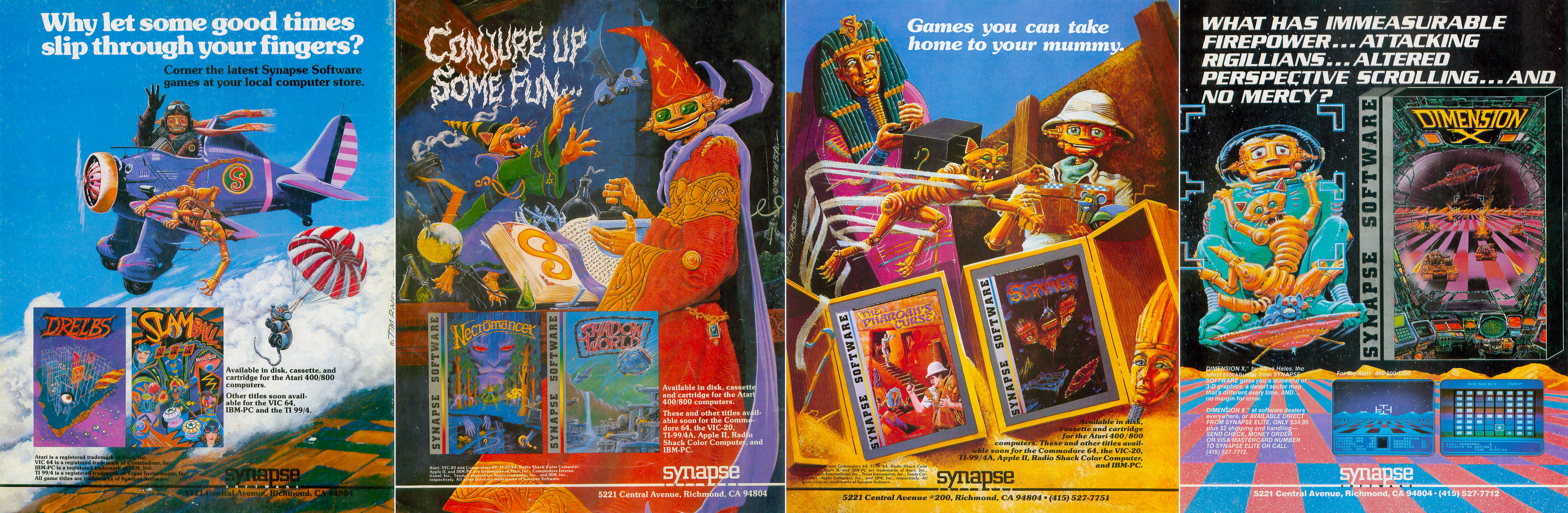 Be kell vallanom, a Synapse Software egyik, itt hirdetett programjával sem játszottam, de a hirdetések, és azokon belül is a förtelmesen visszataszító bronzmacska  látványa miatt muszáj volt megosztanom e képeket. Ezek alkotója (és amúgy csaknem az összes Synapse-játék borítójának festője) Tim Boxell volt, akinek neve teljesen más stílusban készül képregényéről, majd a ’90-es években kisebb hollywoodi karrierjéről lehet talán ismerős.