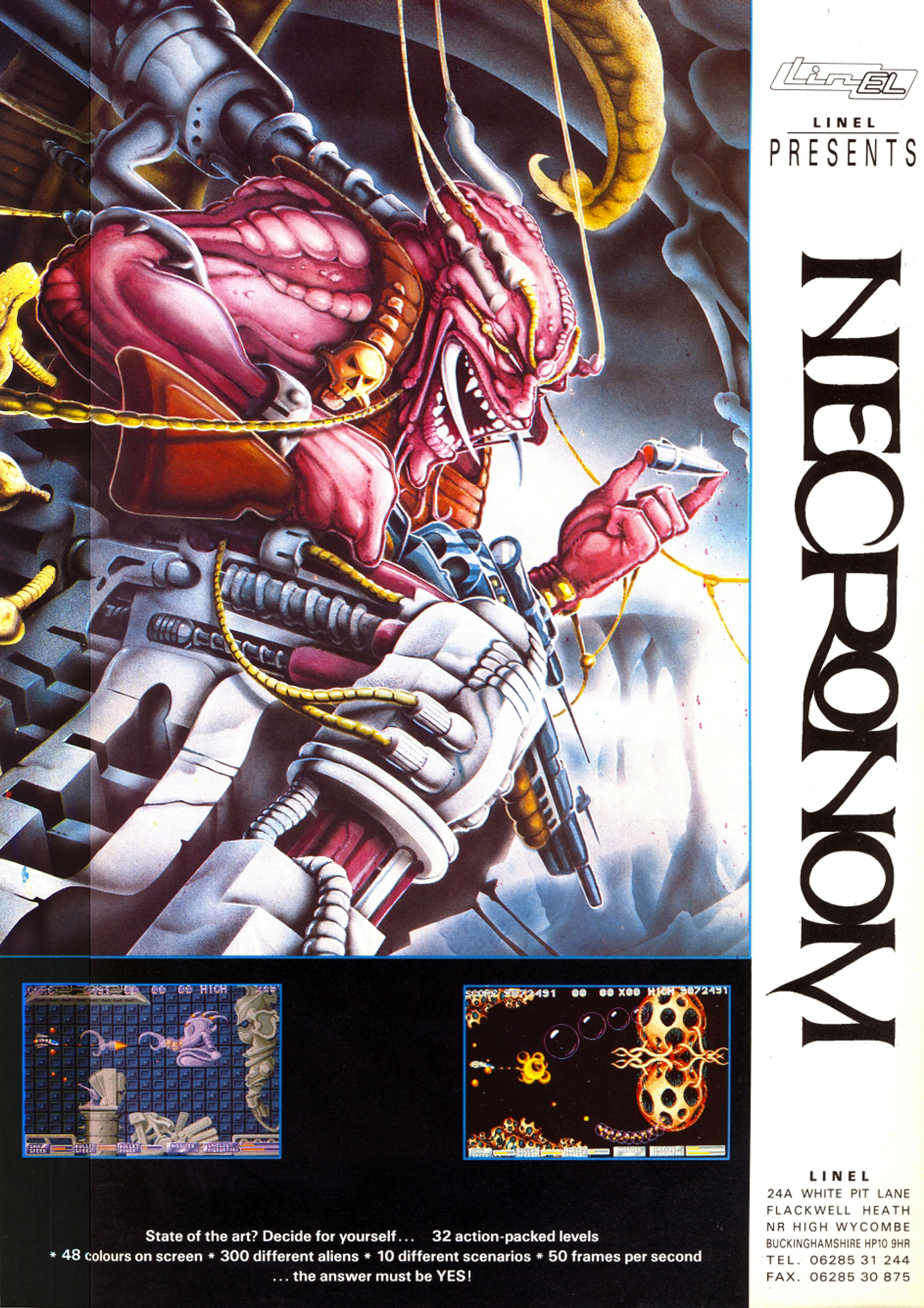 Mi történik, ha néhány fiatal srác összeáll, és a japán játéktermi masinák szeretete által fűtve létrehozzák életük első shoot ’em upját? Néha ebből a nekibuzdulásból a Katakis születik meg, néha pedig a Necronom, amelyre nem véletlenül nem emlékszik a világ – egész konkrétan semmi eredeti nem volt benne. A puskáját kaján vigyorral töltő fura sci-fi démon azonban remek kép, így a reklámnak mindenképp helye van az oldalon!