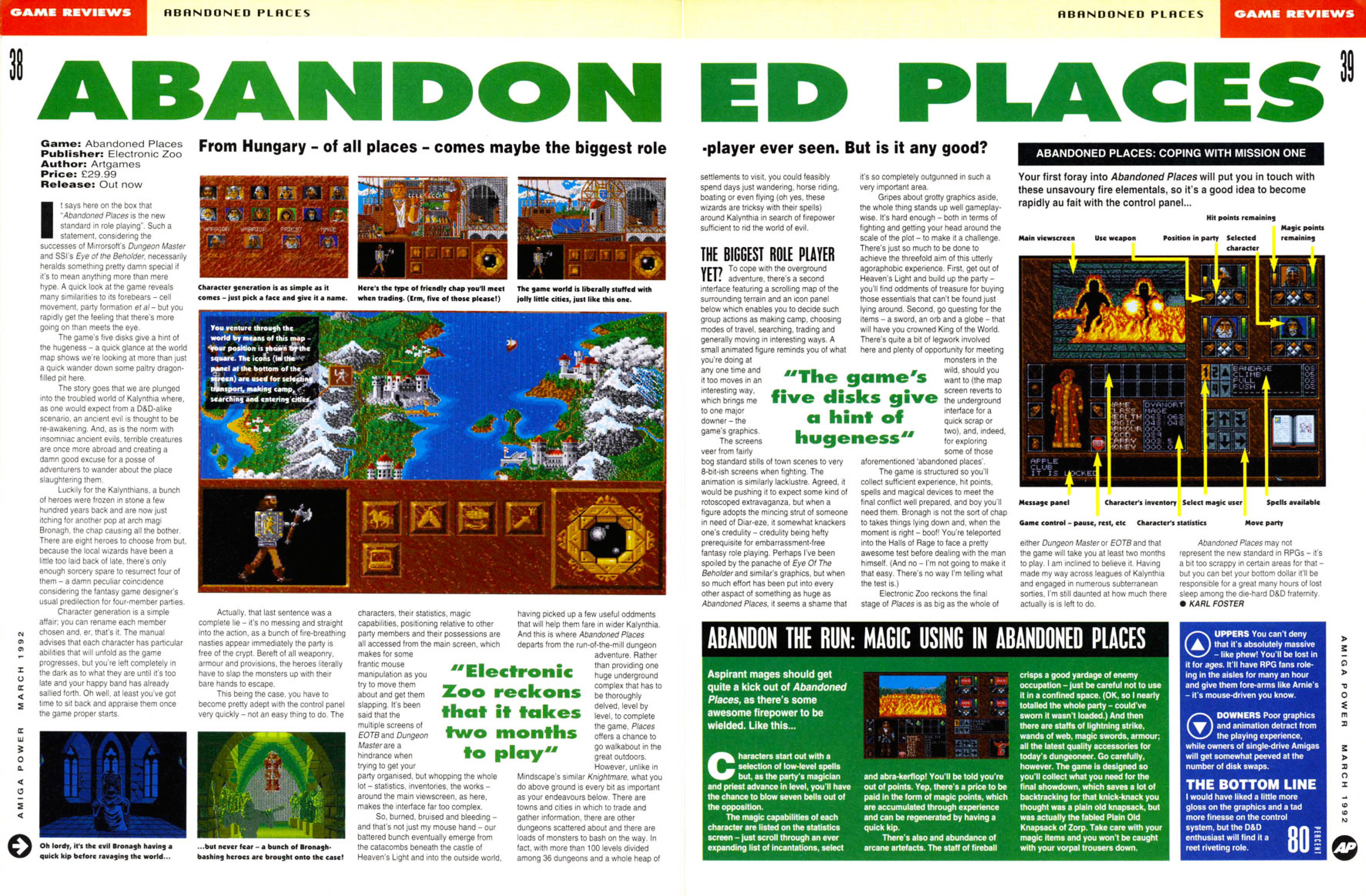 Noha az Abandoned Places abszolút nem a legnagyobb amigás szerepjáték volt (a kétes értékű diadal egyértelműen az egy évvel korábbi Fate: Gates of Dawné), a dicsérő szavak nagy részét így is megérdemelte. Bár a bevallottan a Dungeon Master receptje alapján készült RPG elsősorban nem a műfaj megújításáról szólt, így is igen kellemesen játszható darab volt.