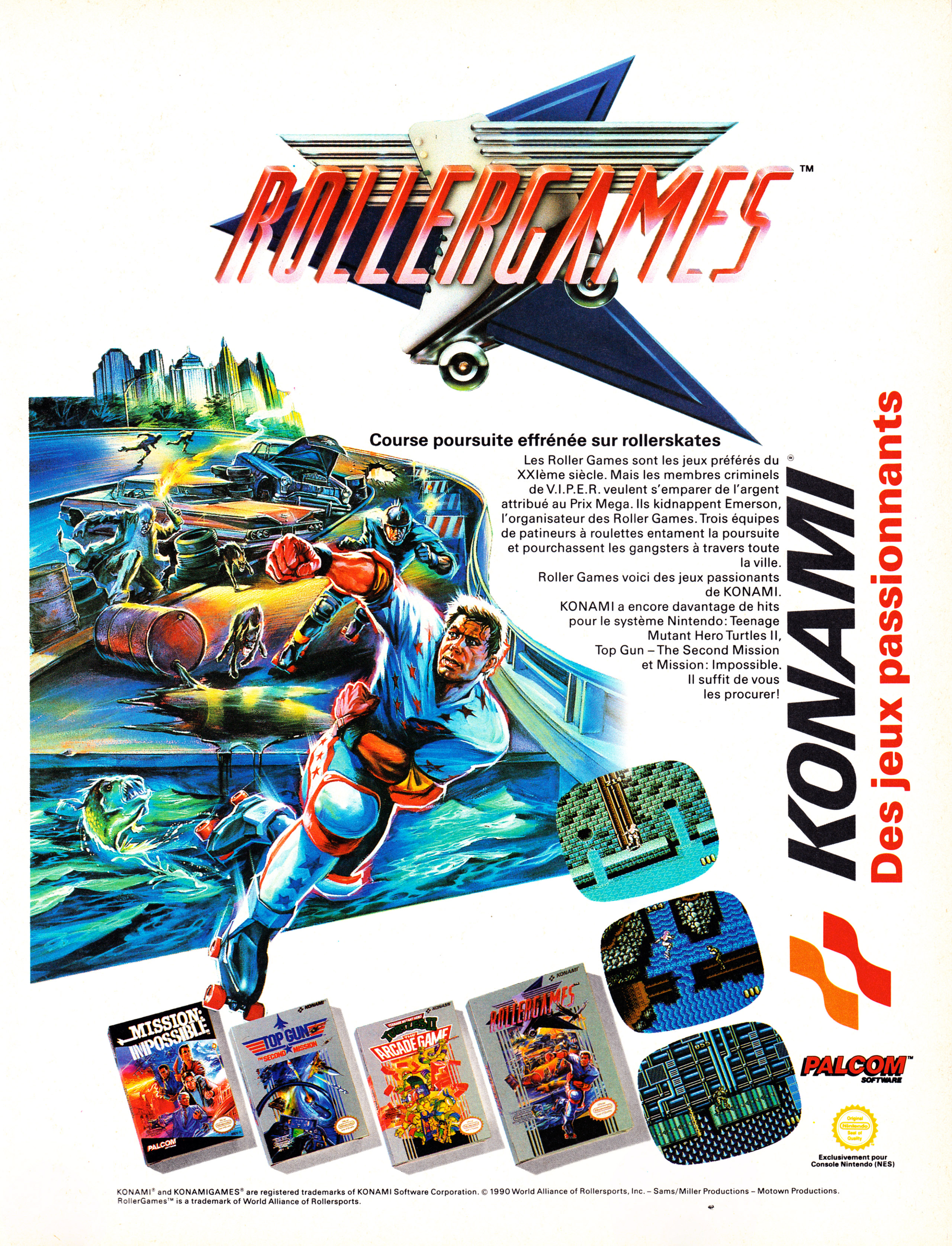 Hogy egy ízig-vérig brit magazinba miként is került bele anno a Rollergames francia nyelvű hirdetése, az majdnem olyan jó kérdés, hogy a Konami egész pontosan mit is akart megannyi NES-klasszikust követően ezzel a rettenettel. A későbbi Treasure stúdió leendő legénységének tekintélyes része végezte a fejlesztést, de a magát sajnos teljesen komolyan vevő görkoris vérengzést még ők sem tudták élvezetesen tálalni.