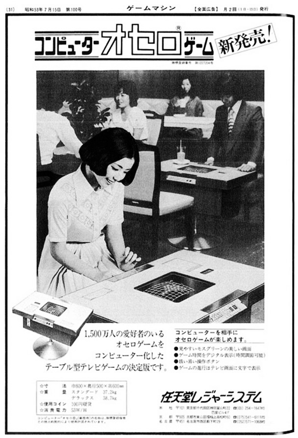 Egy igen korai videojáték-reklám a Nintendótól – a hirdetés a japán játékipari szaklap, a Game Machine 1978 júliusi számában jelent meg. A koktélasztal kiszerelésű gép a Computer Othello, amely természetesen a reversi táblás játék feldolgozása volt.