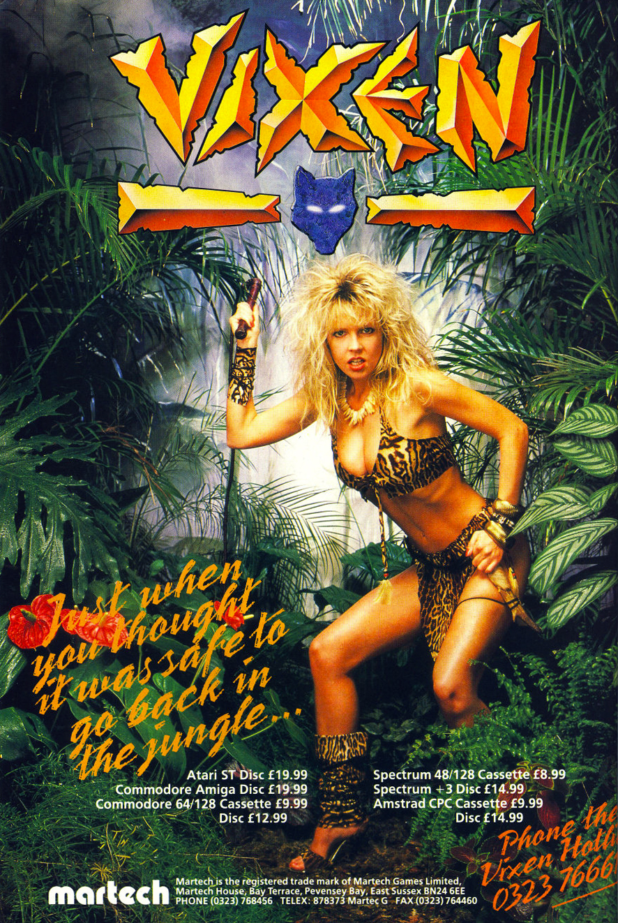 Meggyőződésem, hogy az 1988-as Vixen kizárólag azért jött létre, mert egy évvel korábban a Barbarian hatalmas sikert aratott azzal, hogy borítóján egy szoftpornós hölgy, bizonyos Maria Whittaker tekergett apró bikiniben. A nevüket meghazudtoló teljesítményű játékokat gyártó Intelligent Design stúdió ennek nyomán kitalálta, hogy ha mást nem is, ezt le tudják másolni, így azon nyomban le is igazolták Corinne Russellt, akinek fő foglalkozása az volt, hogy bulvármagazinok harmadik oldalán csábítsa a férfiakat. További random tények róla és a játékról: