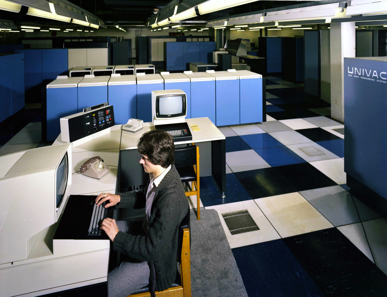 A brit Rutherford Appleton Laboratory (egy állami kutatóintézet) gépterme 1980 körül. A stílusos ruhát viselő úr egy IBM 3036 terminálon keresztül egy IBM System/370-es rendszert használ éppen, de ha úgy döntene, egy UNIVAC 1108 mainframe is a rendelkezésére állna.