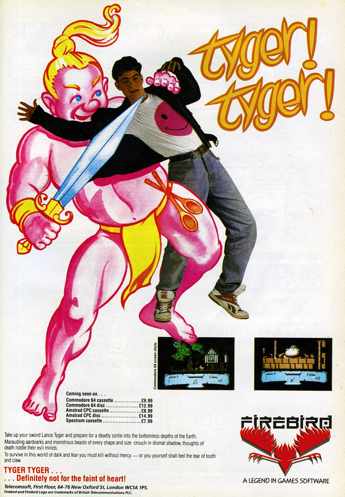 Egy minden képzeletet felulmúlóan bizarr reklám egy végül meg nem jelent programhoz – igazi játéktörténelmi ereklyéről van szó tehát. A Tyger! Tyger! Commodore 64-re készült 1989-ben, és végül a kiadó azért állt el a kiadásától, mert az az elfogadhatónál nagyságrendekkel jobban hasonlított a Capcom Black Tigerjéhez. Nem sokkal vagyunk a Great Giana Sisters és a Katakis balhéi után, és az éppen a MicroProse általi felvásárlásét menedzselni próbáló Firebird kiadónak semmi szüksége nem volt zavaró tényezőkre.