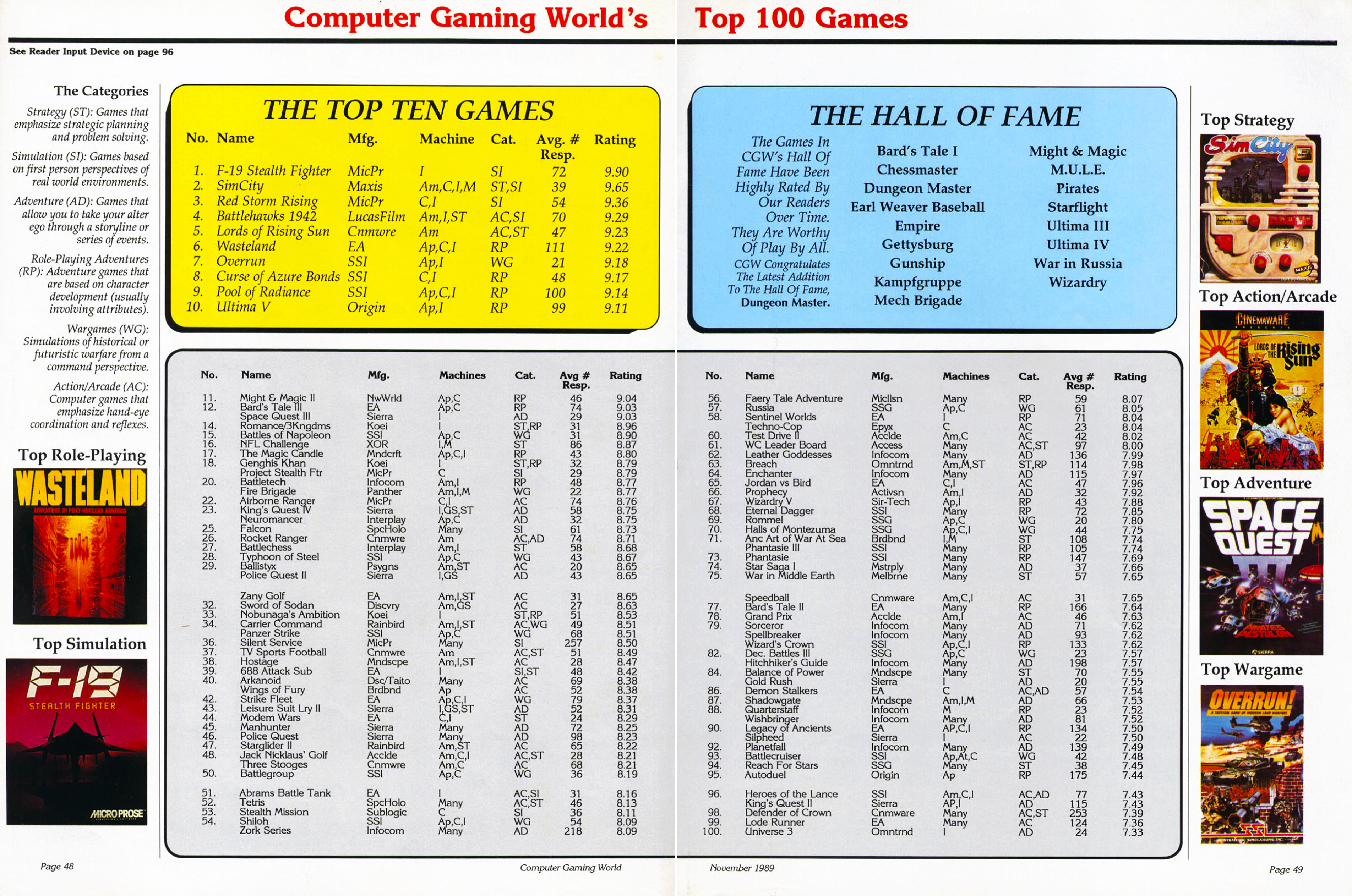 A még a korhoz képest is hardcore olvasói táborral rendelkező CGW aktuális népszerűségi listája 1989 végéről. Bár az ajnározott stratégiai játékokat mára jószerivel mindenki elfelejtette (még a Hírességek Csarnokába kerültek jó részét is), azért találni tényleg értékes, vagy legalább később komoly sorozattá fejlődő programokat a listában. A platformok között az (IBM) PC-t az „I” betű jelöli.