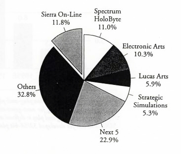 Az 1993-as amerikai számítógépes piac tortája az öt legnagyobb kiadó megnevezésével. Az előző évben a Spectrum Holobyte a Microprose, az Electronic Arts pedig az Origin Systems felvásárlásával lépett előre nagyot. A LucasArts és az SSI pedig pont azért fért fel a listára, mert két nagy vetélytársuk e felvásárlások hatására megszűnt önálló cégként létezni.