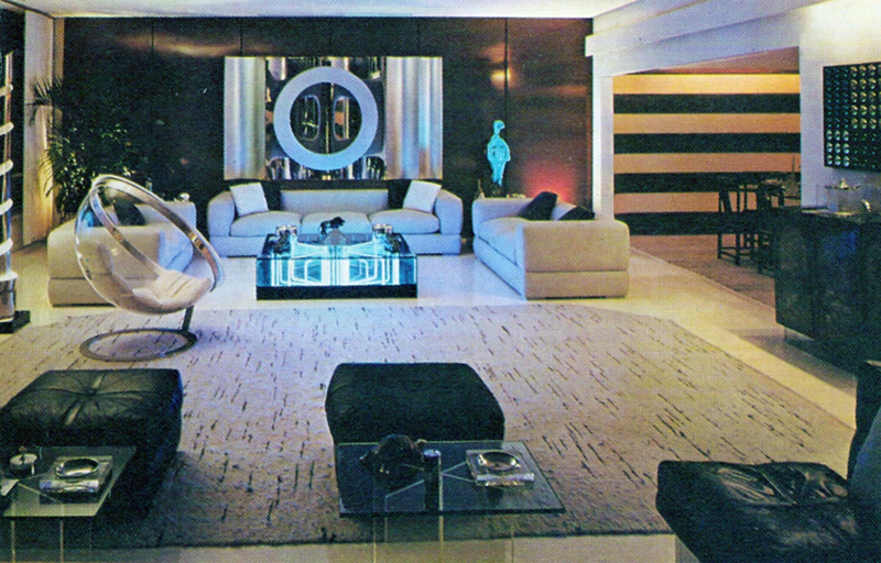 Egy különleges nappali egy, a hetvenes évek lakberendezési vívmányait bemutató albumból. A kísérő leírás szerint e szoba a bevilágítást próbálta újraértelmezni, és a kék LED-ekkel tömött üvegasztalka alapján azt mondhatjuk, sikerrel; az akár egy mai PC LED-gazdag háza is lehetne...