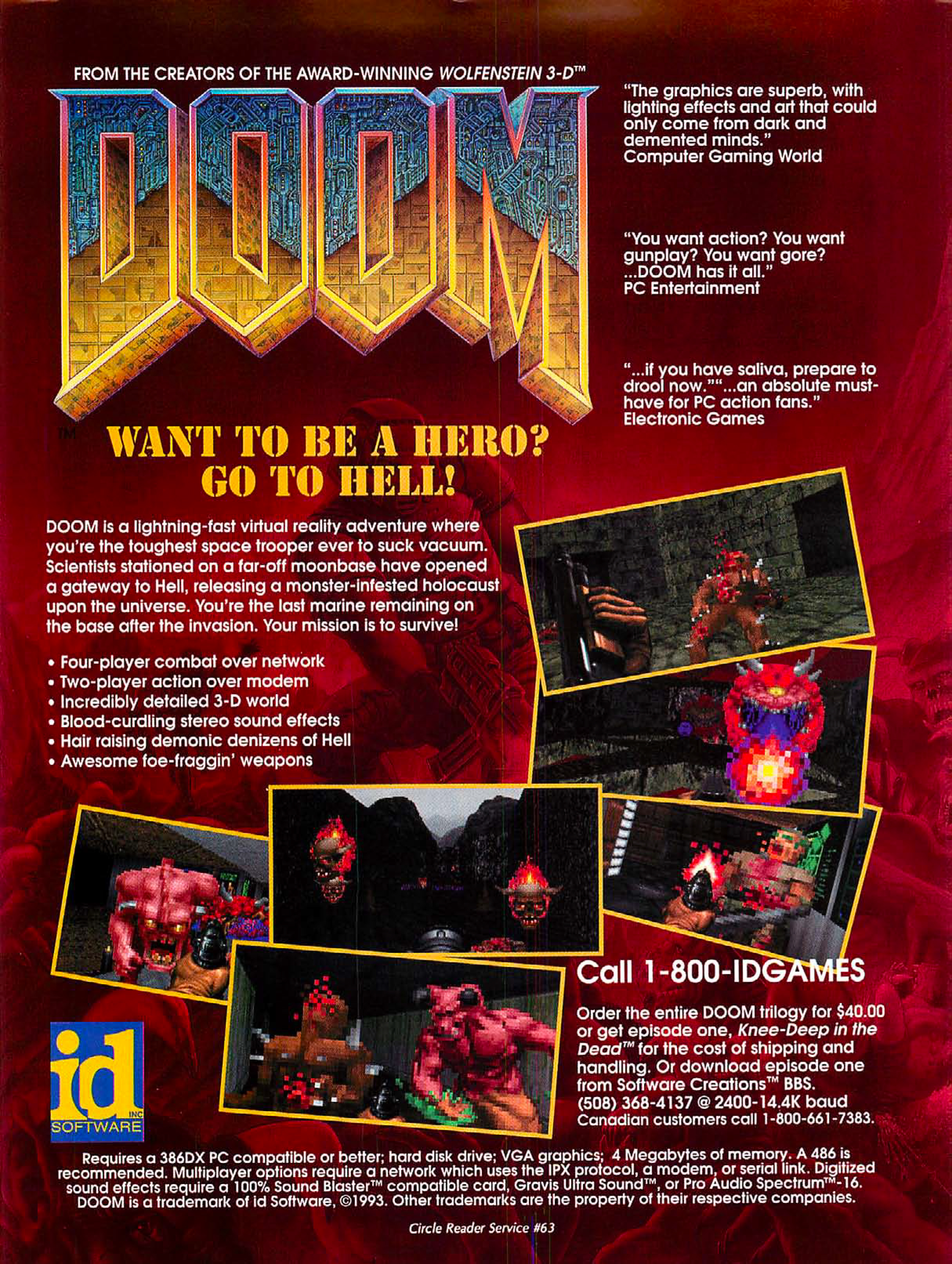 Nem tudom, hogy pontosan kinek is köszönhetjük az FPS szót, de az biztos, hogy nagy szolgálatot tett az emberiségnek: az első Doom saját leírása szerint ugyanis egy „virtuális valóság kaland” volt. Szintén érdekes, hogy a legelső hirdetés szerint a program még nem a Marson, hanem a Holdon játszódott; hát ennyire volt fontos a játék háttérsztorija...