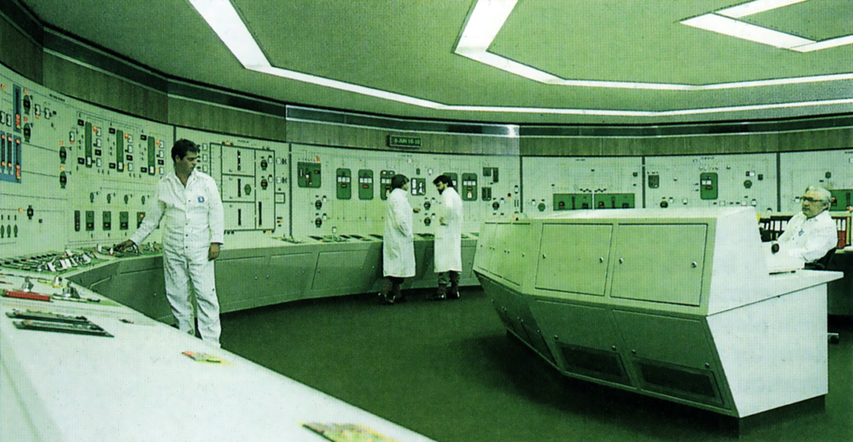 A sellafieldi nukleáris erőmű irányítóterme valamikor a nyolcvanas évek közepén. 1957-ben egy tűz itt okozta a brit történelem legnagyobb nukleáris katasztrófáját; ma a hely már nem reaktorként, hanem radioaktív hulladékok tárolójaként és megsemmisítő üzemeként működik.