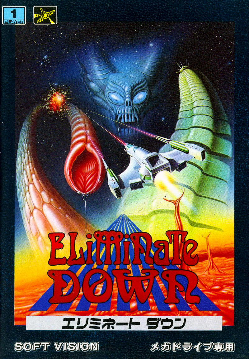 Ki tudja, mit is akarhattak kifejezni az Eliminate Down címmel a mindössze ezt az egyetlen játékot elkészítő Aprinet stúdió derék fejlesztői? Az mindenesetre biztos, hogy az erősen csápospornó-hangulatot sugárzó, ám ennek ellenére is kifejezetten szépen megkomponált borító, illetve a rémületesen nem ahhoz illő logó nem segítenek megválaszolni a kérdést..